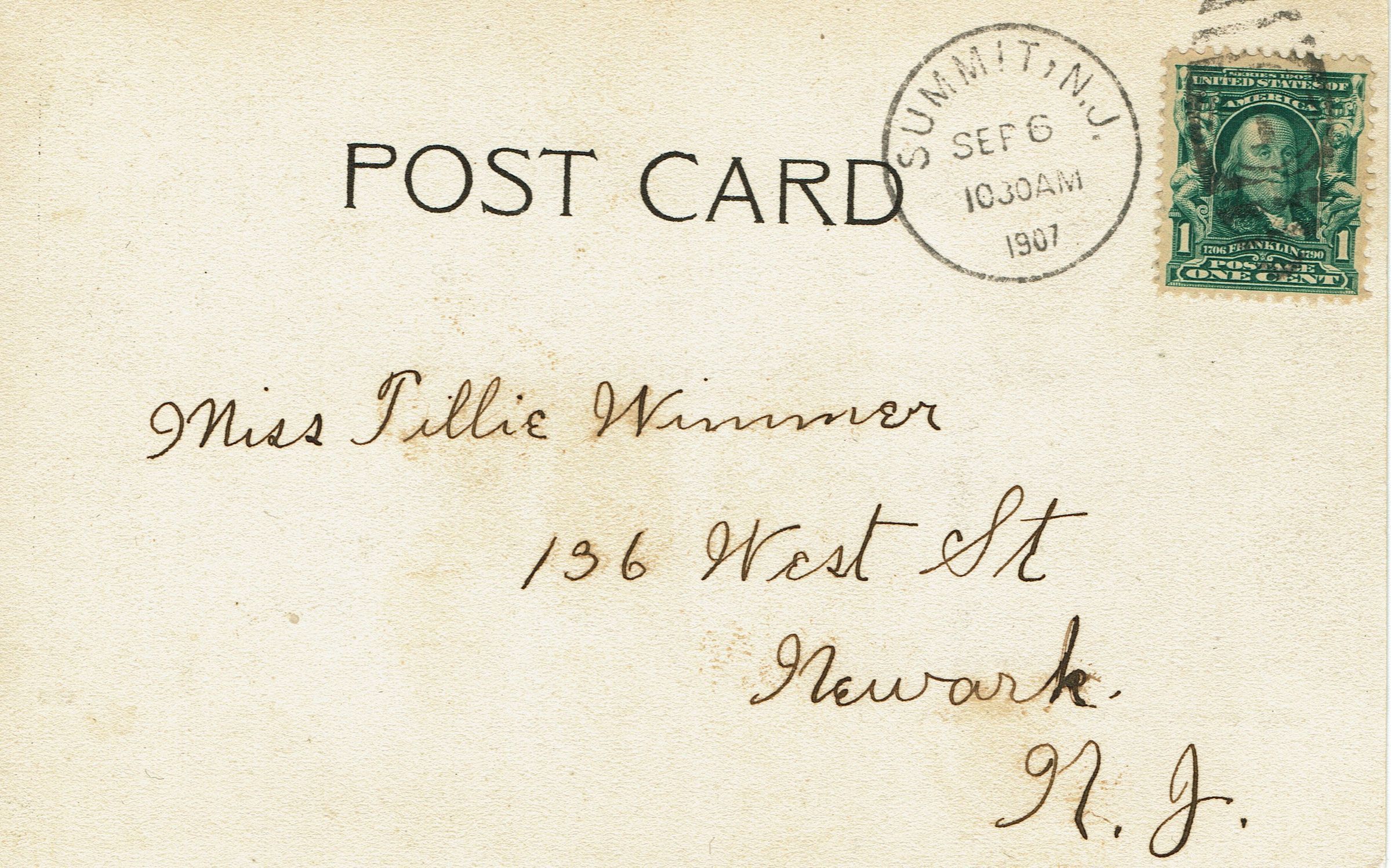 Postally used B&W photographic postcard of the Lackawanna Station, Short Hills. Message on front: "This station is no more. T.L." T.L. probably refers to Thomas Lynch, who married Emma Wimmer, Tillie's sister. Addressed to Miss Tillie Wimmer, 136 West Street, Newark, NJ. Postmarked Summit, N.J. September 6, 1907, 10:30 am.