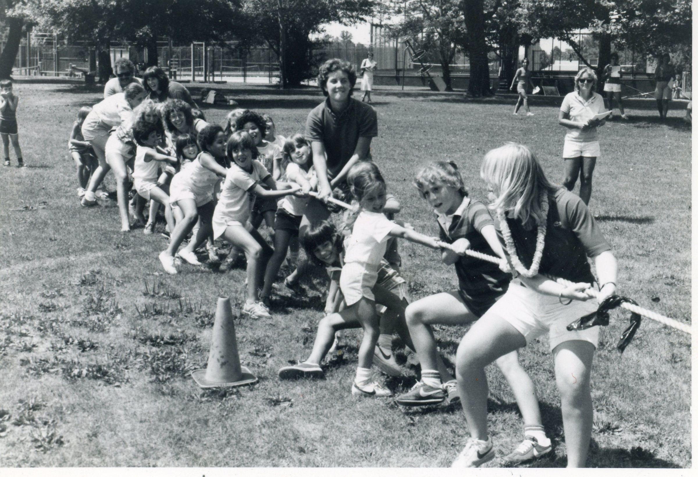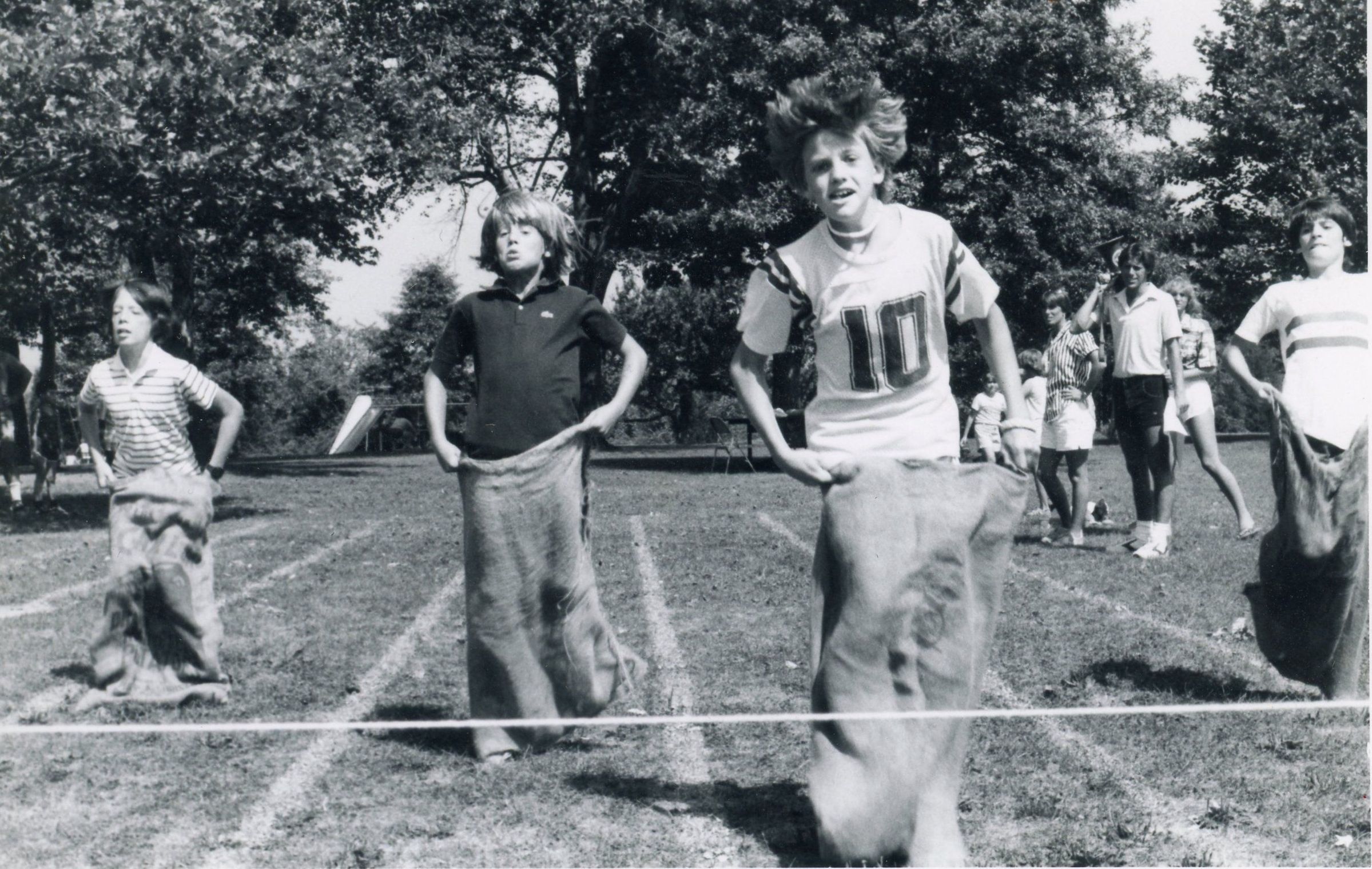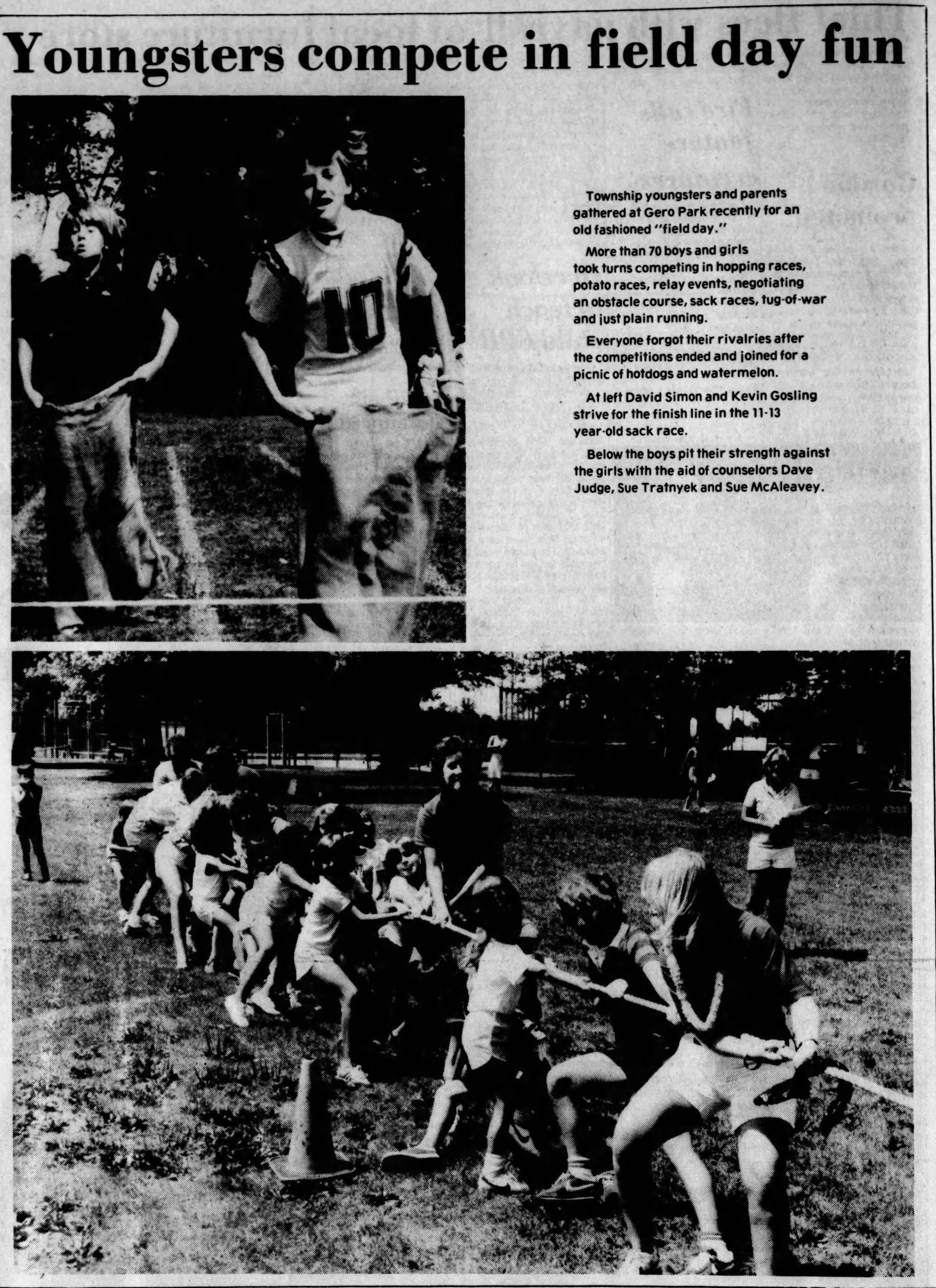 Photographs from the Millburn Recreation Department's Field Day, August 11, 1983. Top photograph shows David Simon and Kevin Gosling in the Sack Race. Bottom photograph shows counselors Dave Judge, Sue Tratnyek and Sue McAleavey participating with campers in a tug-of-war contest.Acquisition