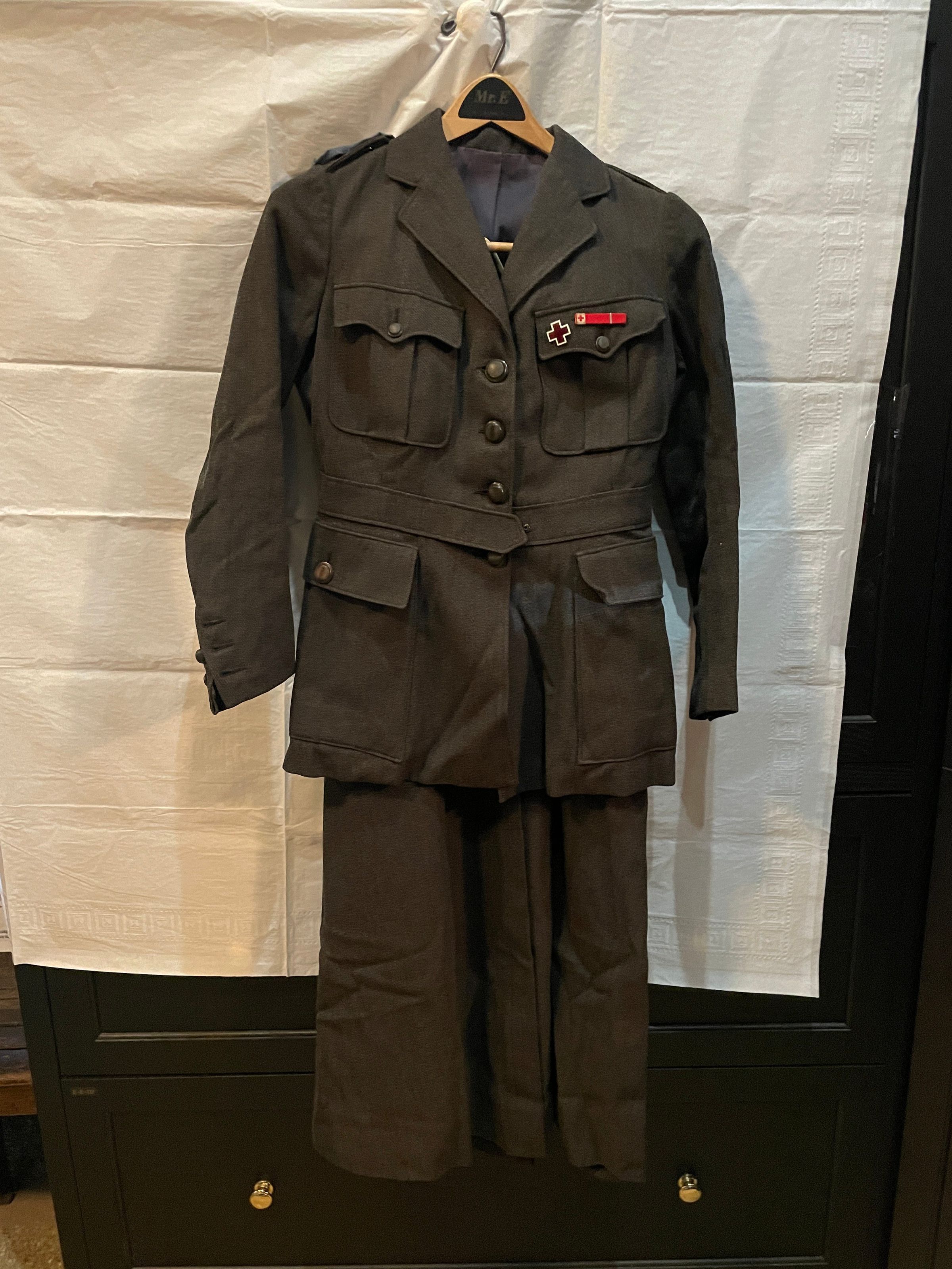 2 part uniform, with the upper jacket (2016.006.088A) and separate lower skirt (2016.006.088B). 2 pins on the left chest, 1 Red Cross cross enamel pin, and 1 WW2 Volunteer Service Bar symbolizing 1 year of service and 500 hours of volunteering.