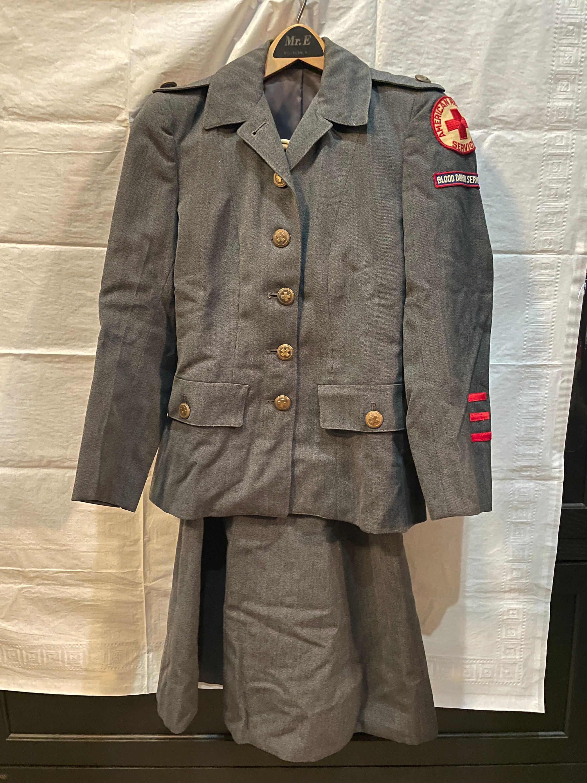 The upper half is a wool dark gray suit, with red cross buttons. 2 badges on the left hand sleeve: "American Red Cross Service" & "Blood Donor Service". 3 stripe insignia on the left sleeve. (2016.006.087A)