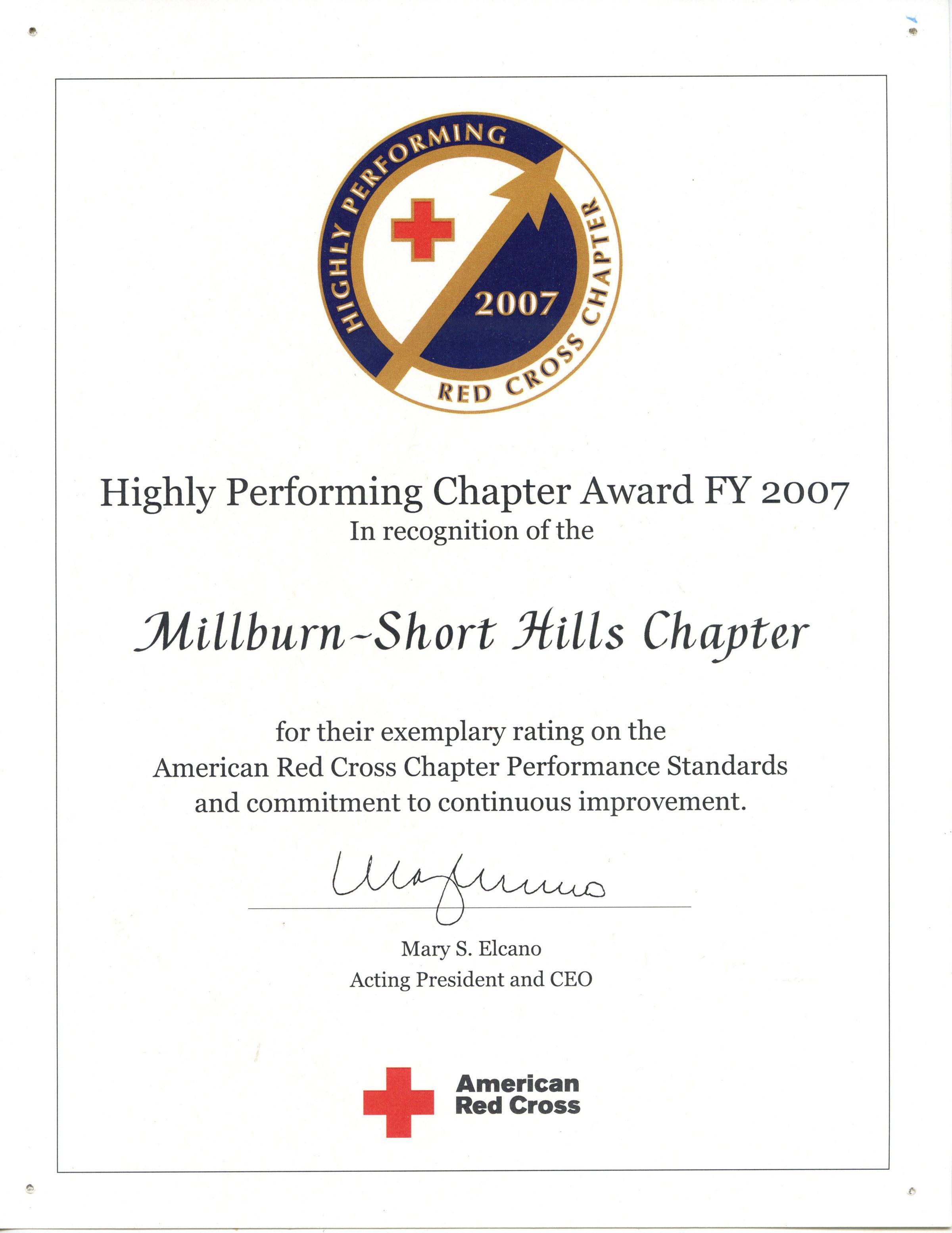 Highly performing chapter award FY given to the Millburn-Short Hills Chapter of the Red Cross for their exemplary rating on their American Red Cross Chapter Performance Standards and commitment to continuous improvement.Acquisition