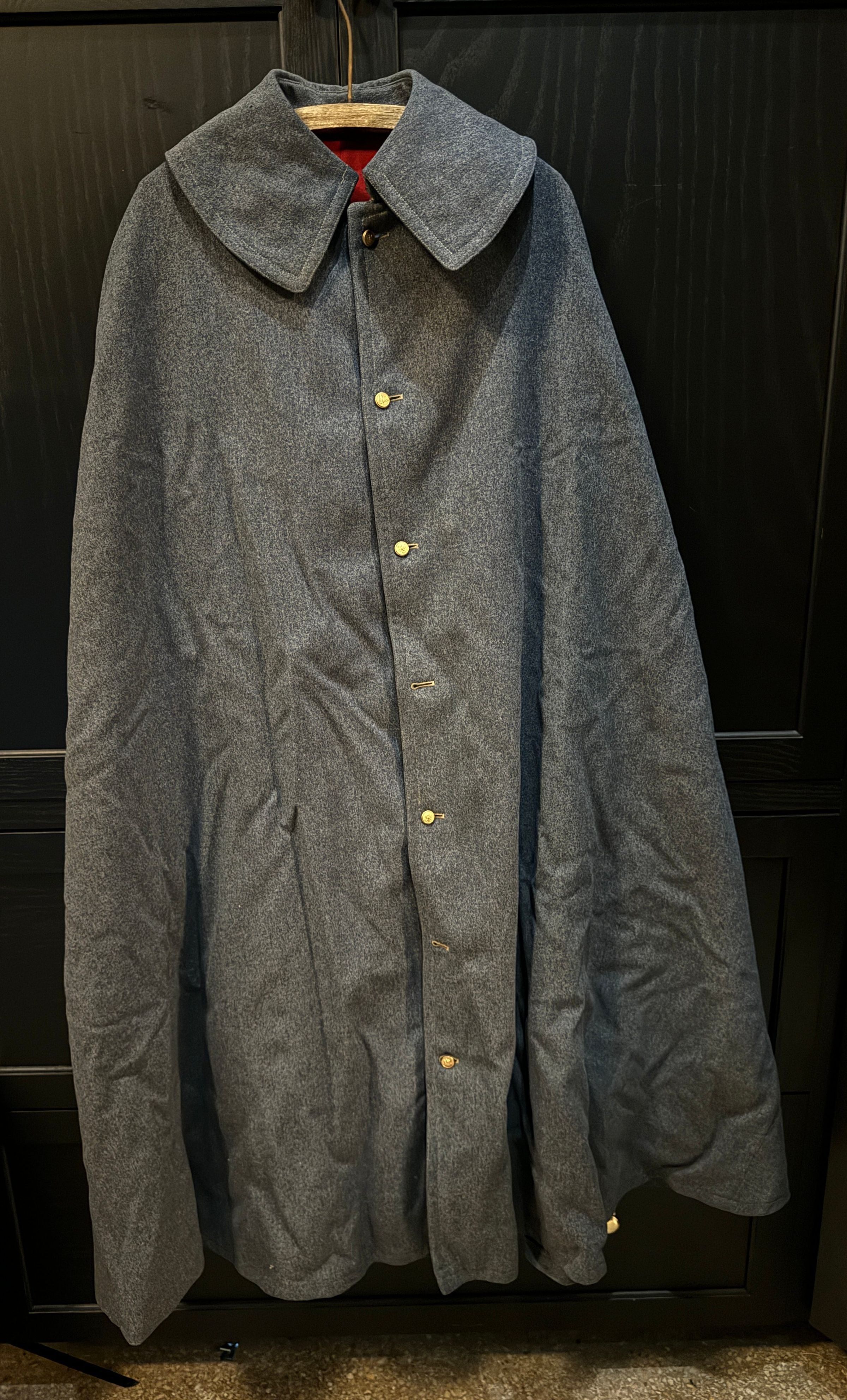 Large dark blue, cotton (?) cape. Has a deep red inner lighting. Gold buttons showing an eagle holding an anchor (likely representing the Marine Corps).Acquisition