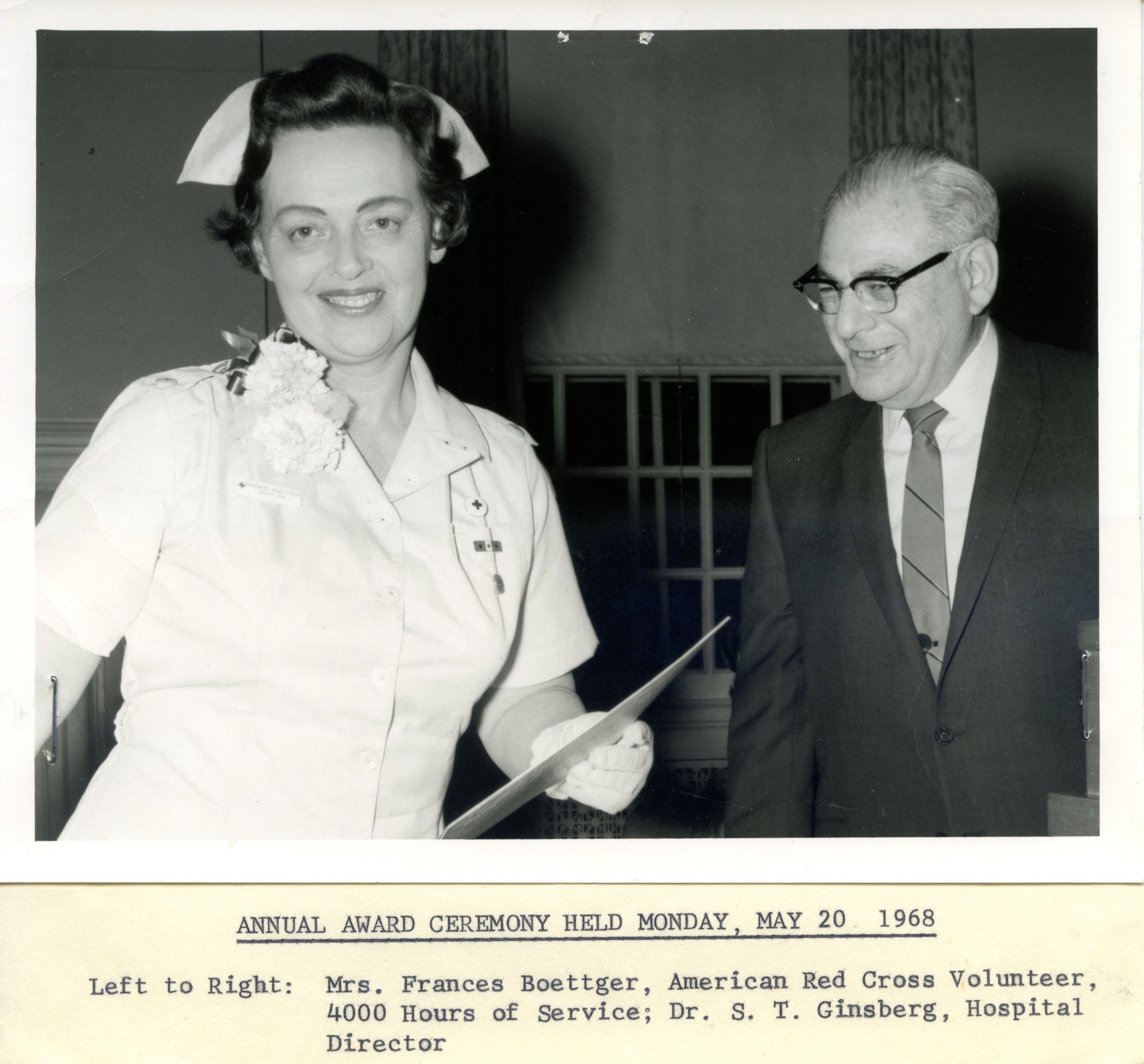Photo of Mrs. Frances Boettger, an American Red Cross Volunteer with a certificate for 4000 hours of service, and Dr. S. T. Ginsberg, hospital director at the Annual Award Ceremony held Monday, May 20, 1968.Acquisition