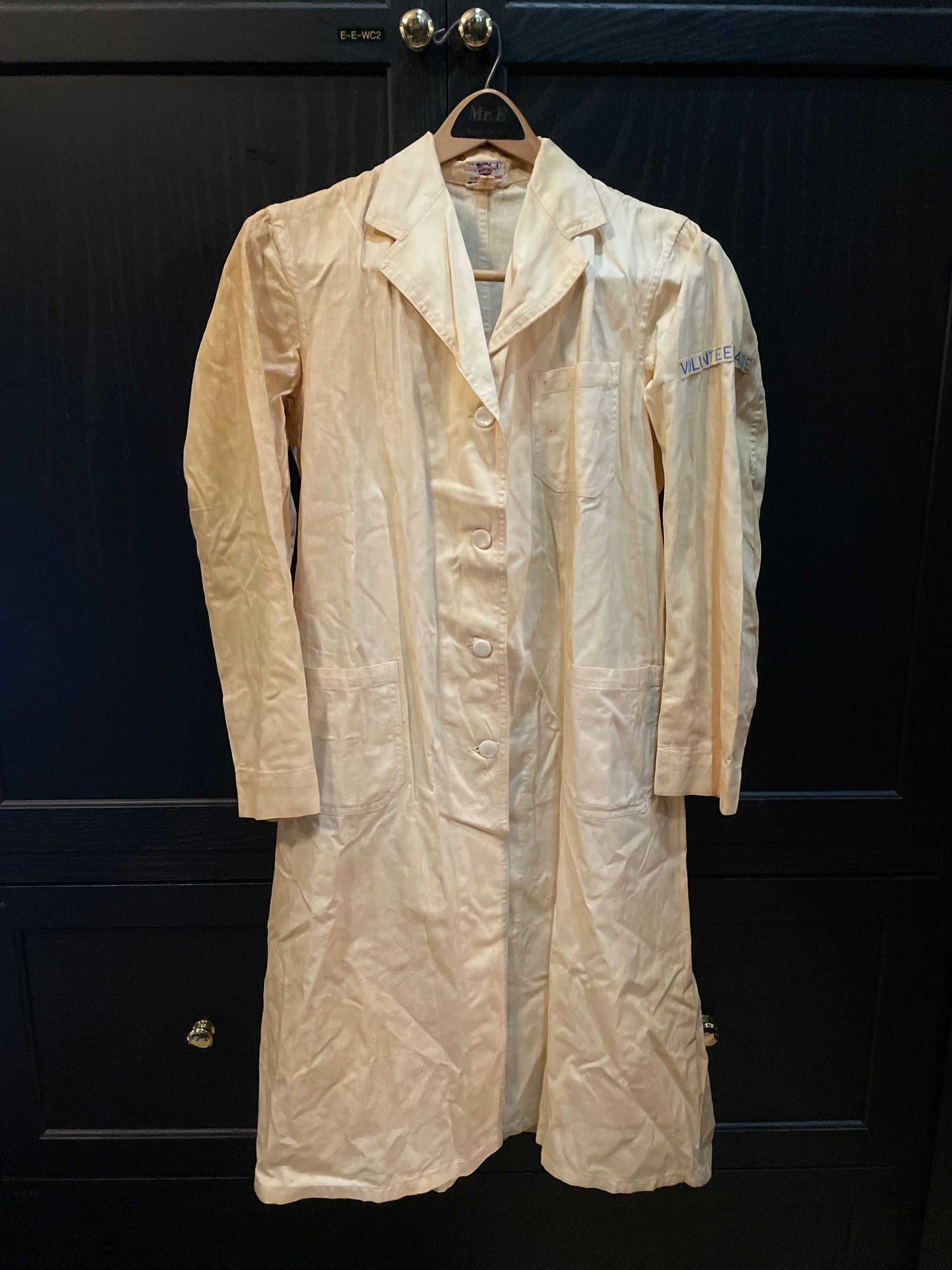 Red cross yellow full length uniform, with a "Volunteer aid" patch on the left shoulder.