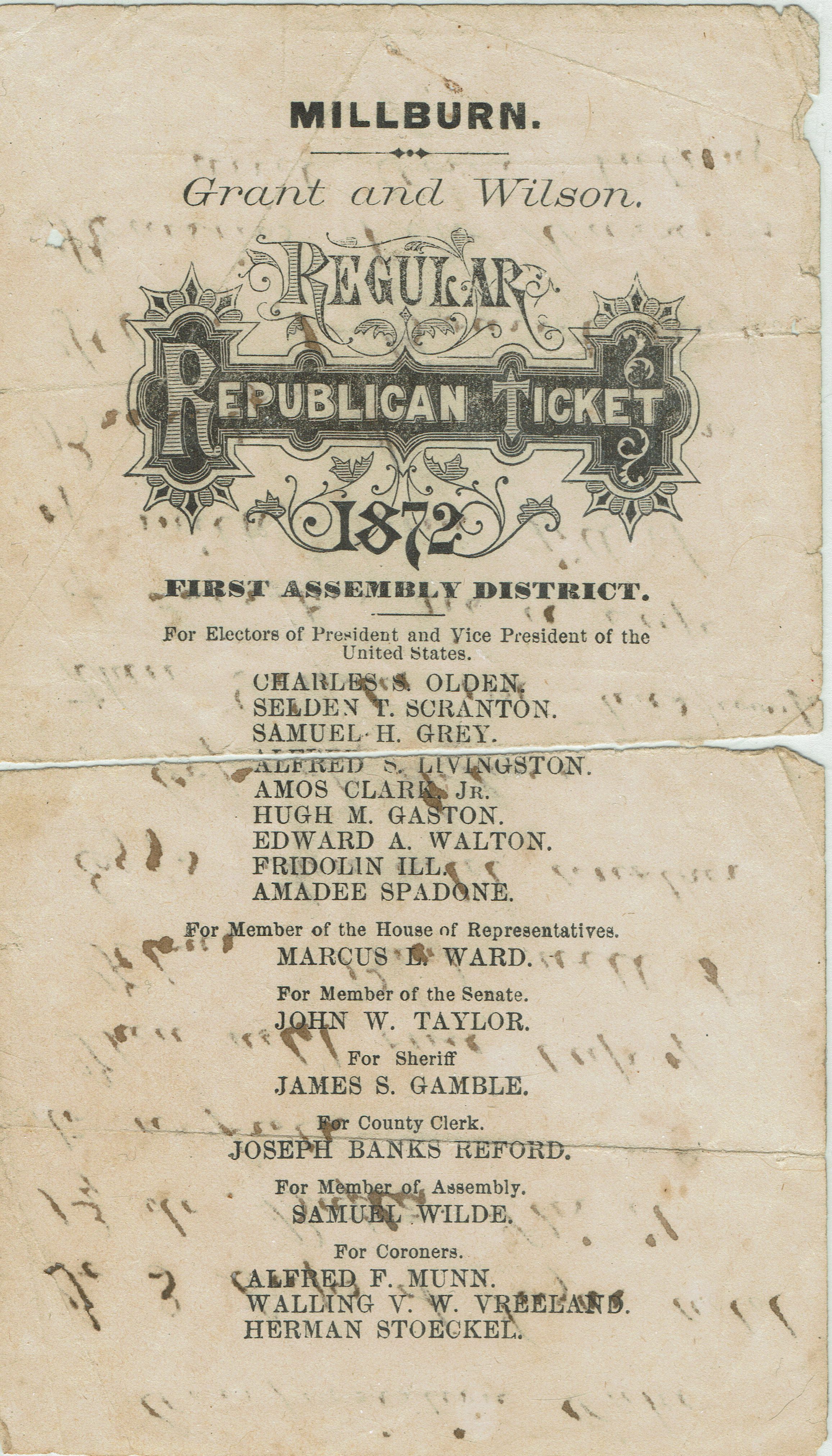 Millburn Regular Republican Ticket, 1872. First Assembly District for Electors of President and Vice President of the United States. Handwritten cake recipe on verso.