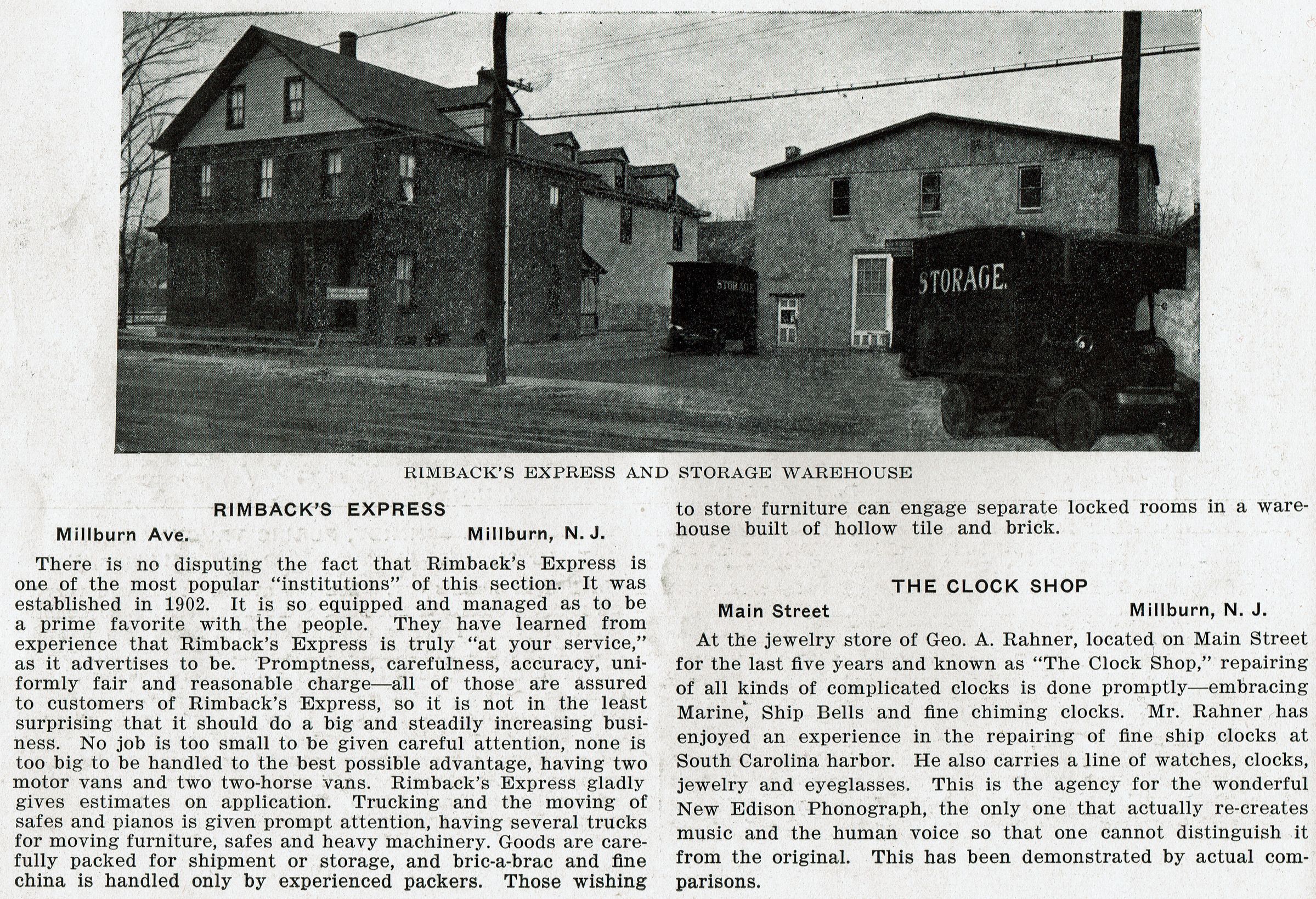Photograph of Rimback's Express Moving Company and Storage Warehouse on Millburn Avenue from "South Orange, Maplewood, Millburn & Springfield, N.J." New York: G.W. Richardson (undated), belonging to William Mangold (60 Whittingham Terrace, Millburn). See: 2022.236.020.