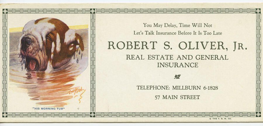 Ink blotter from the Robert S. Oliver real estate and general insurance business formerly at 57 Main Street in Millburn. The business was apparently established in 1929 and Robert Oliver apparently died in 1937, so the date of this item is a guesstimate. The corners of the blotter are very slightly bumped The back of the unused blotter is rose pink and has no marks on it. The front left side of the card is printed with a color picture of a puppy(?) with suds on its head and beneath that is "His Morning Tub" The artist's name is unclear (Robt York?). On the right side is printed: "You May Delay, Time Will Not; Let's Talk Insurance Before It Is Too Late" and "Robert S. Oliver, Jr.; Real Estate and General Insurance; Telephone: Millburn 6-1828; 57 Main Street" In tiny letters on the bottom right edge is the copyright symbol and "The T.D.M. Co." (the Thomas D. Murphy Company." Purchased on eBay from Joseph Keenan; 1012 Kipling Rd; Elizabeth NJ 07208-1039 for $4.99 + $.99 postage.Acquisition