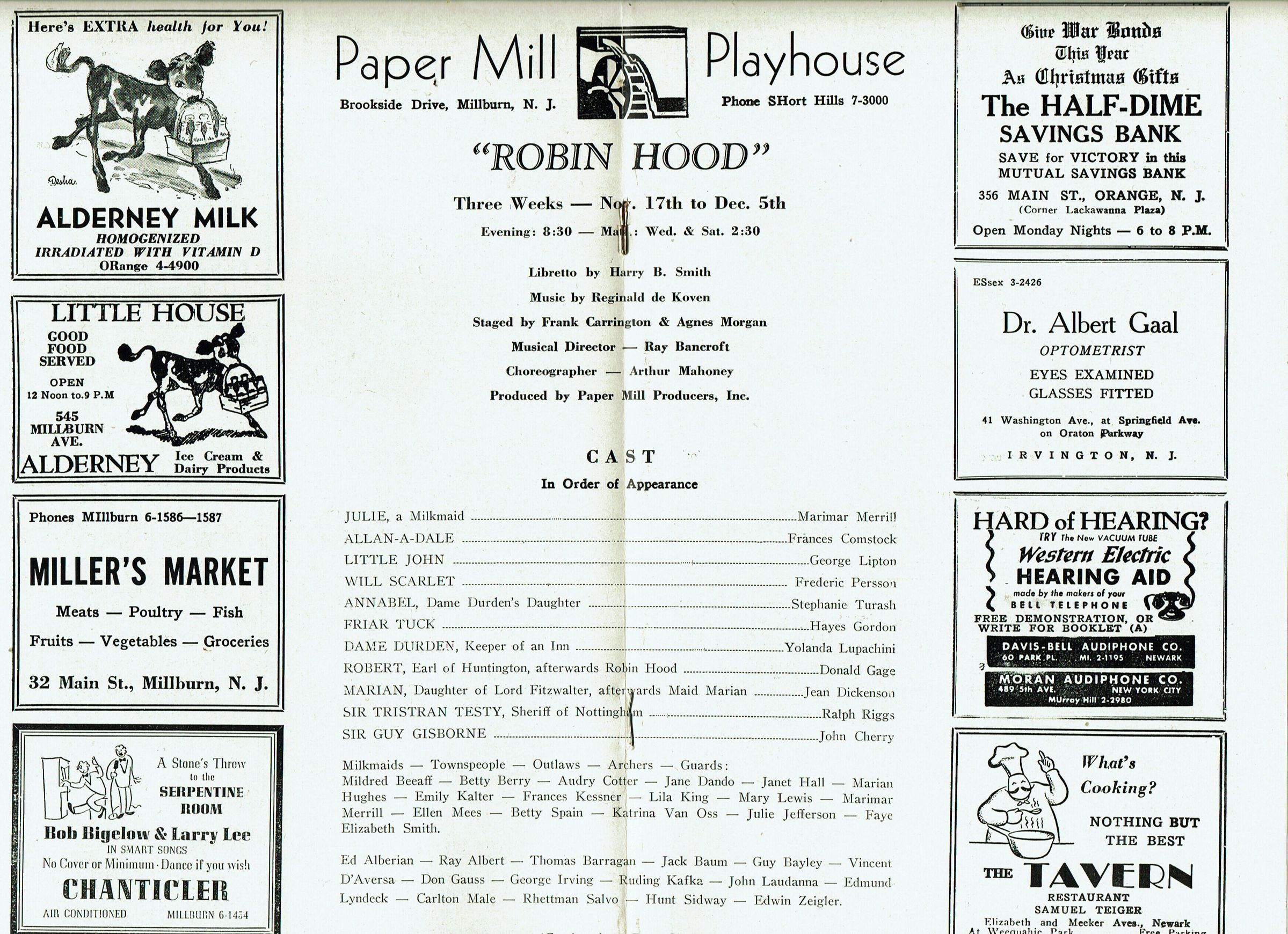 Souvenir Program for 1942 Paper Mill Playhouse Production of "Robin Hood" with Jean Dickenson, Donald Gage and Ralph Riggs. Deluxe fully illustrated program with photographs and articles about Paper Mill Playhouse. 20 pp. (Unpaginated). 8 page program included. Illustrated with advertisements for local businesses.Collection