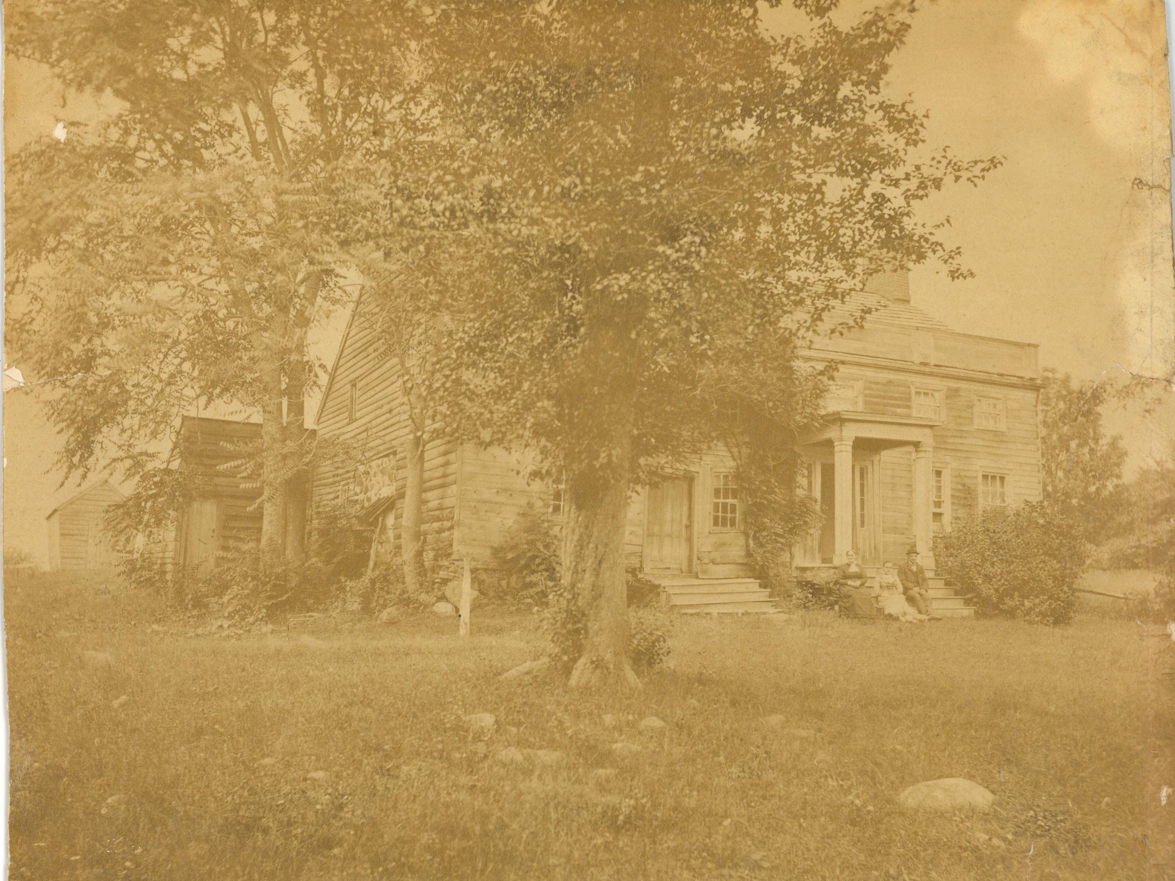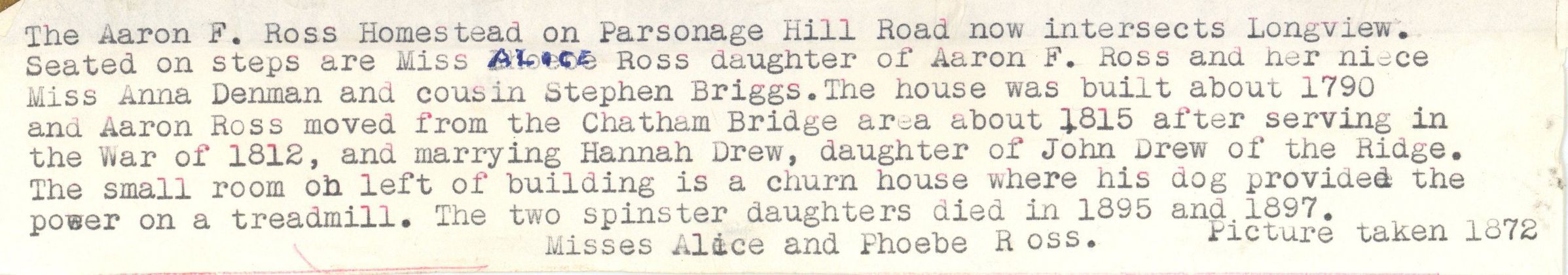 Photograph of the Aaron F. Ross Homestead on Parsonage Hill Road at Long Hill taken in 1872. According to the identification label glued to the bottom of the photograph: Seated on the steps are Miss Alice Ross (daughter of Aaron F. Ross), Miss Anna Denman (her niece) and Steven Briggs (cousin). The house was built about 1790 and Aaron Ross moved from the Chatham Bridge area about 1815 after serving in the War of 1812. He married Hannah Drew. daughter of John Drew of the Ridge. The small room on the left of the building is a churn house, where his dog provided the power on a treadmill. The two "spinster" daughters, Misses Alice and Phoebe Ross, died in 1895 and 1897.