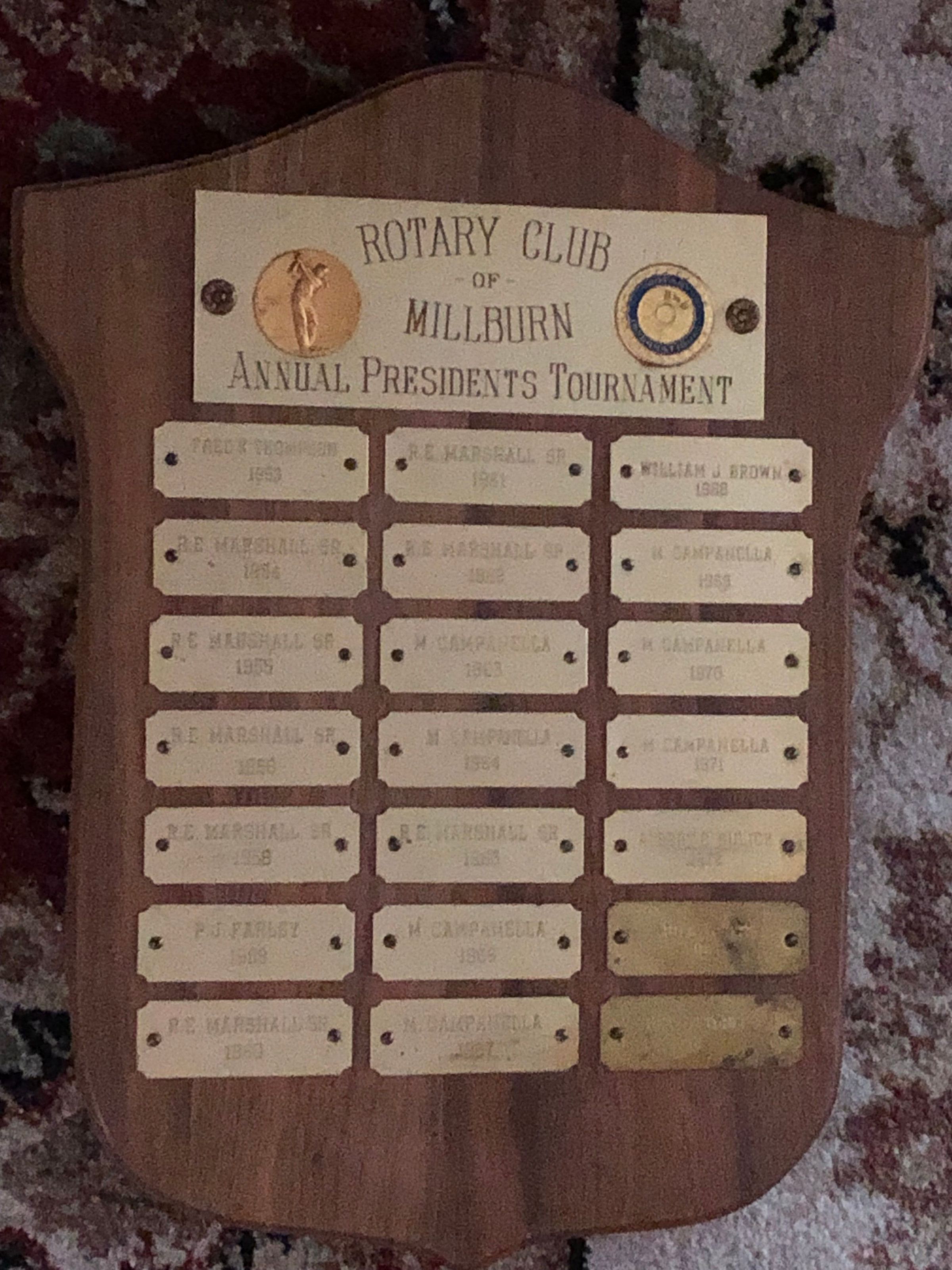 Wooden Plaque with brass plates containing names and years of winners in the Rotary Club Presidents Tournament for the years 1953-1974. The winners were: Fred K. Thompson (1953), R.E. Marshall, Sr. (1954-1958), P.J. Farley (1959)m R.E. Marshall, Sr. (1960-1962), M. Campanella (1966-1967), William J. Brown (1958), M. Campanella (1969-1971), Albert c. Sulick (1972), Bill White (1973), Gene O'Toole (1974).
