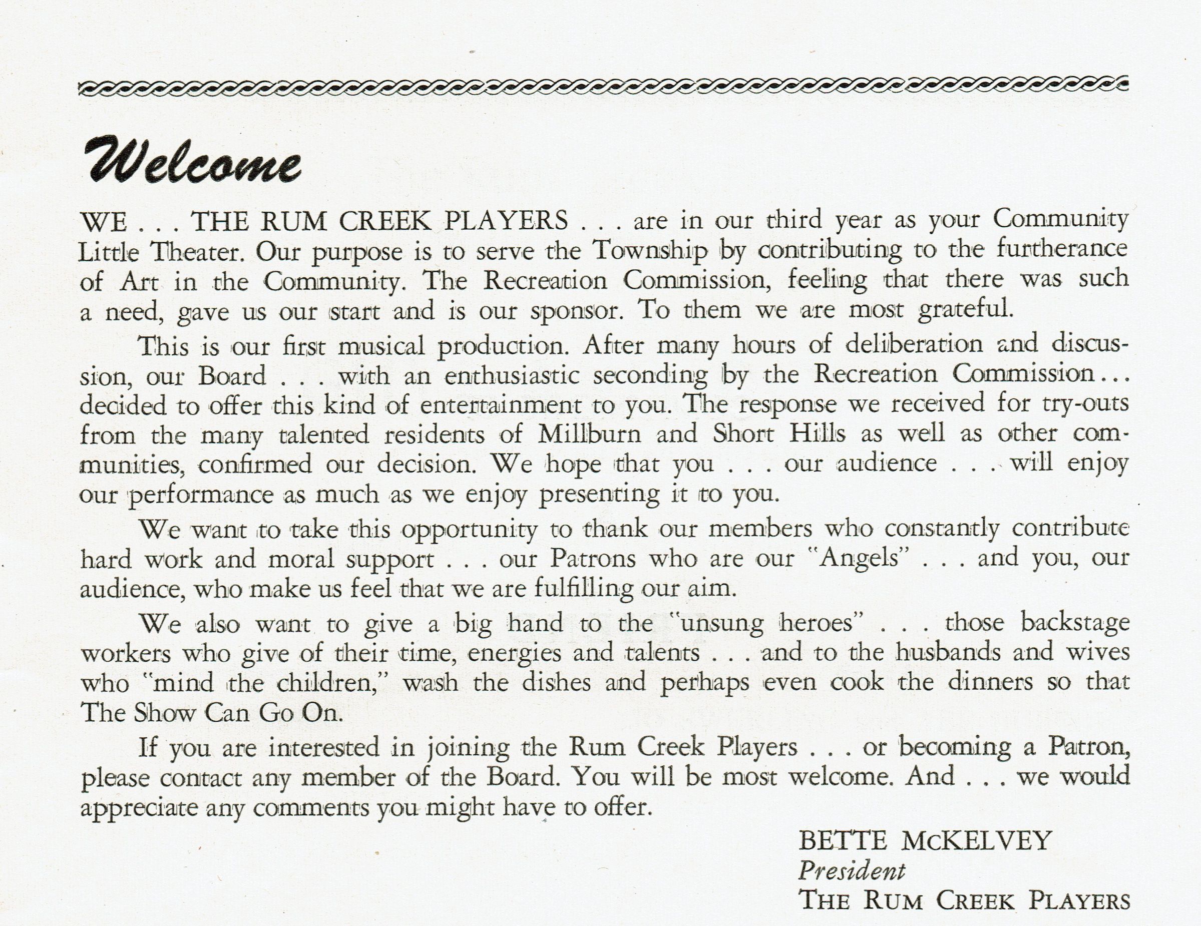The Rum Creek Players was a community theater starting in fall 1960 and sponsored by the Millburn Township Recreation Commission.Acquisition