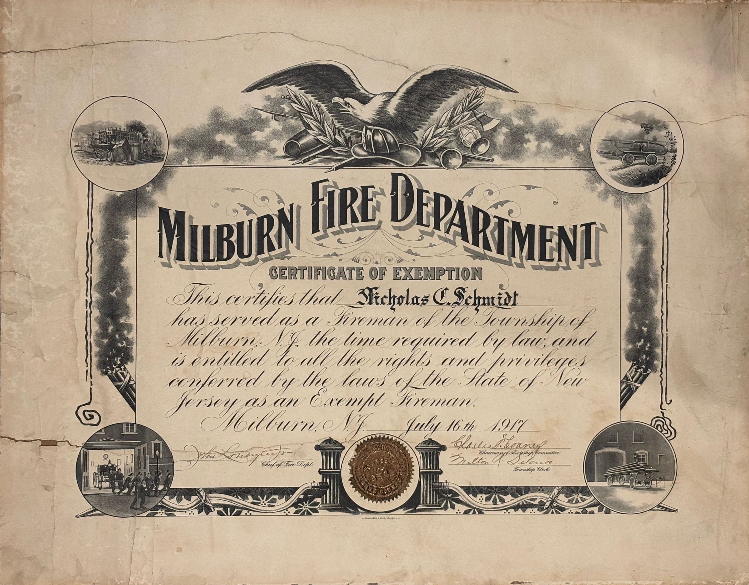 Certificate reads: This certifies that Nicholas C. Schmidt has served as a Fireman of the Township of Milburn, N.J. the time required by law and is entitled to all the rights and privileges conferred by the laws of the State of New Jersey as an Exempt Fireman.Acquisition