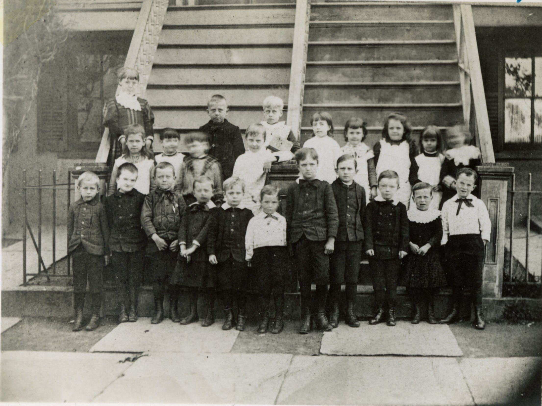 Photograph of children by the steps of a school. No information available about which school or the children. Part of the Centennial Collection.Collection