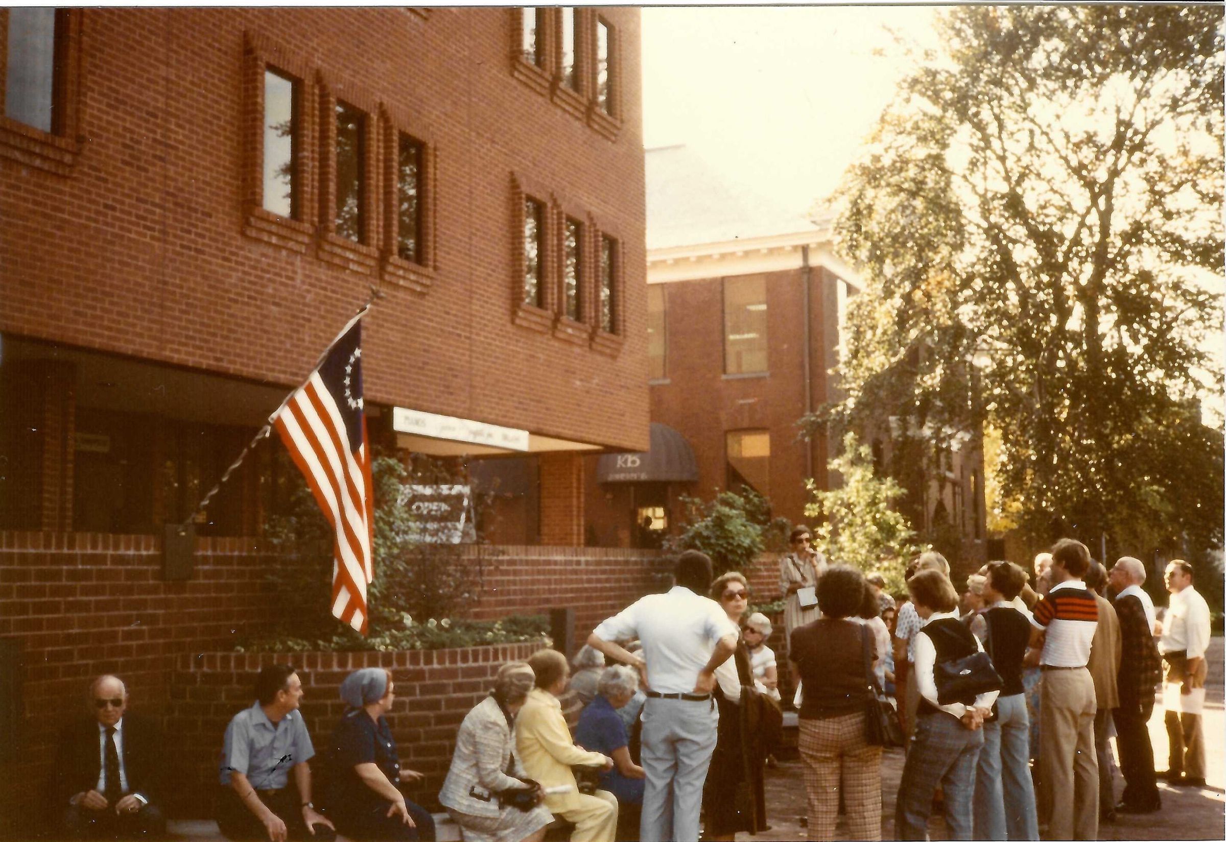 Photograph of a group of people near Schoolhouse Plaza on Millburn Avenue during a Millburn Short Hills Historical Society Walking Tour in October 1980.Acquisition
