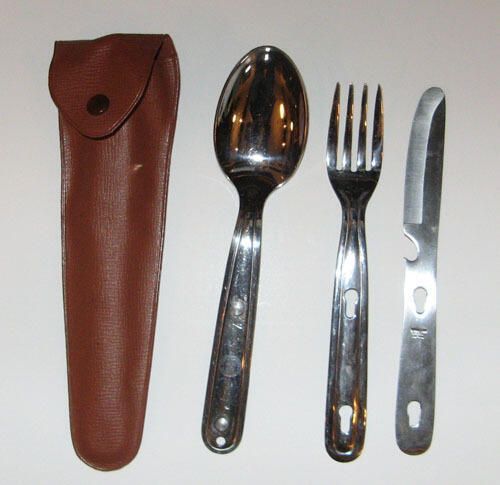 Four-piece stainless steel heavy-duty Boy Scout utensil kit with knife, fork and spoon that clip together and fit into plastic brown case.Acquisition