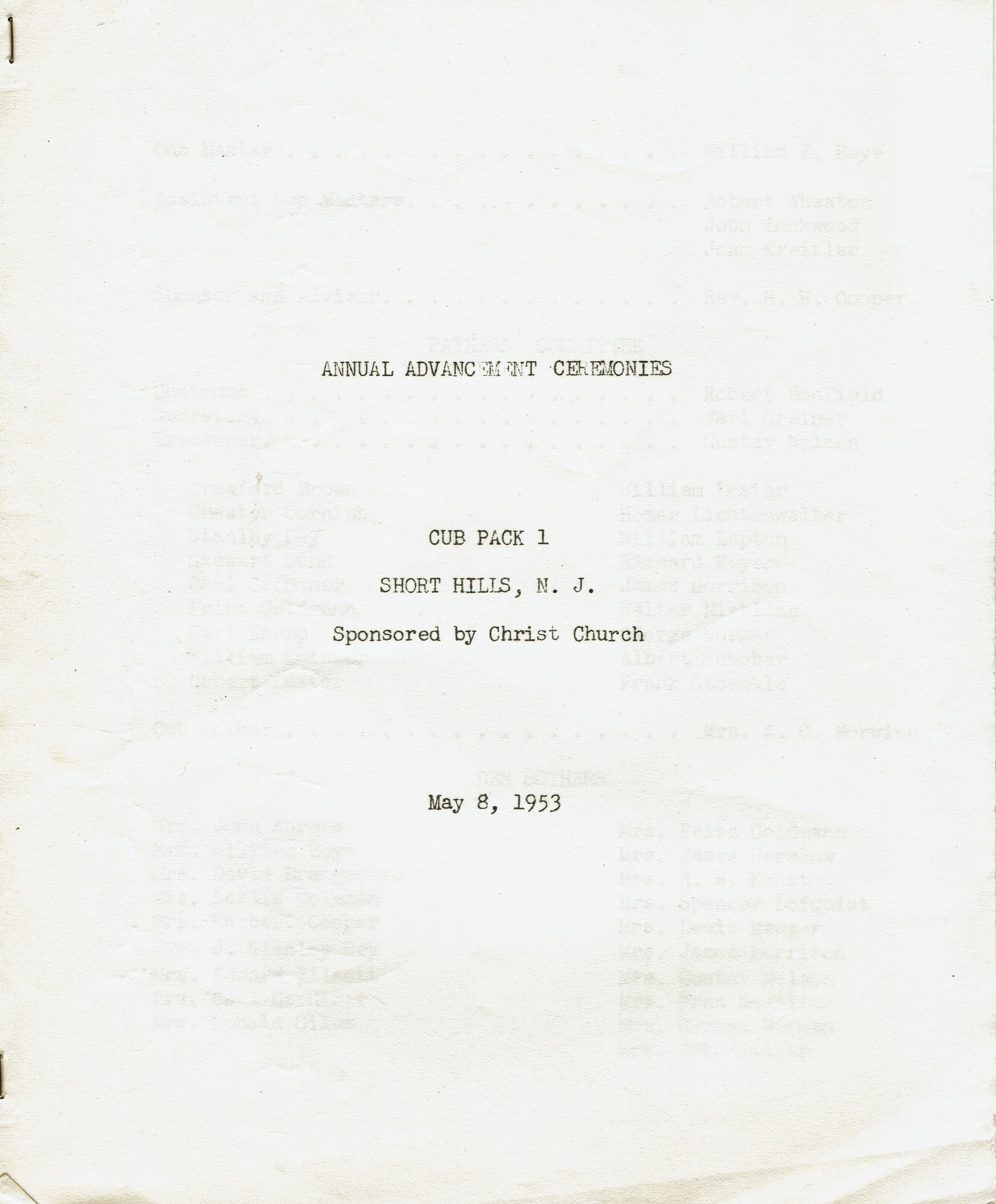 Short Hills Cub Scout Pack 1 Advancement Ceremonies Program, may 8, 1953. 6 pp. Plus separate 1-page award night schedule.Acquisition