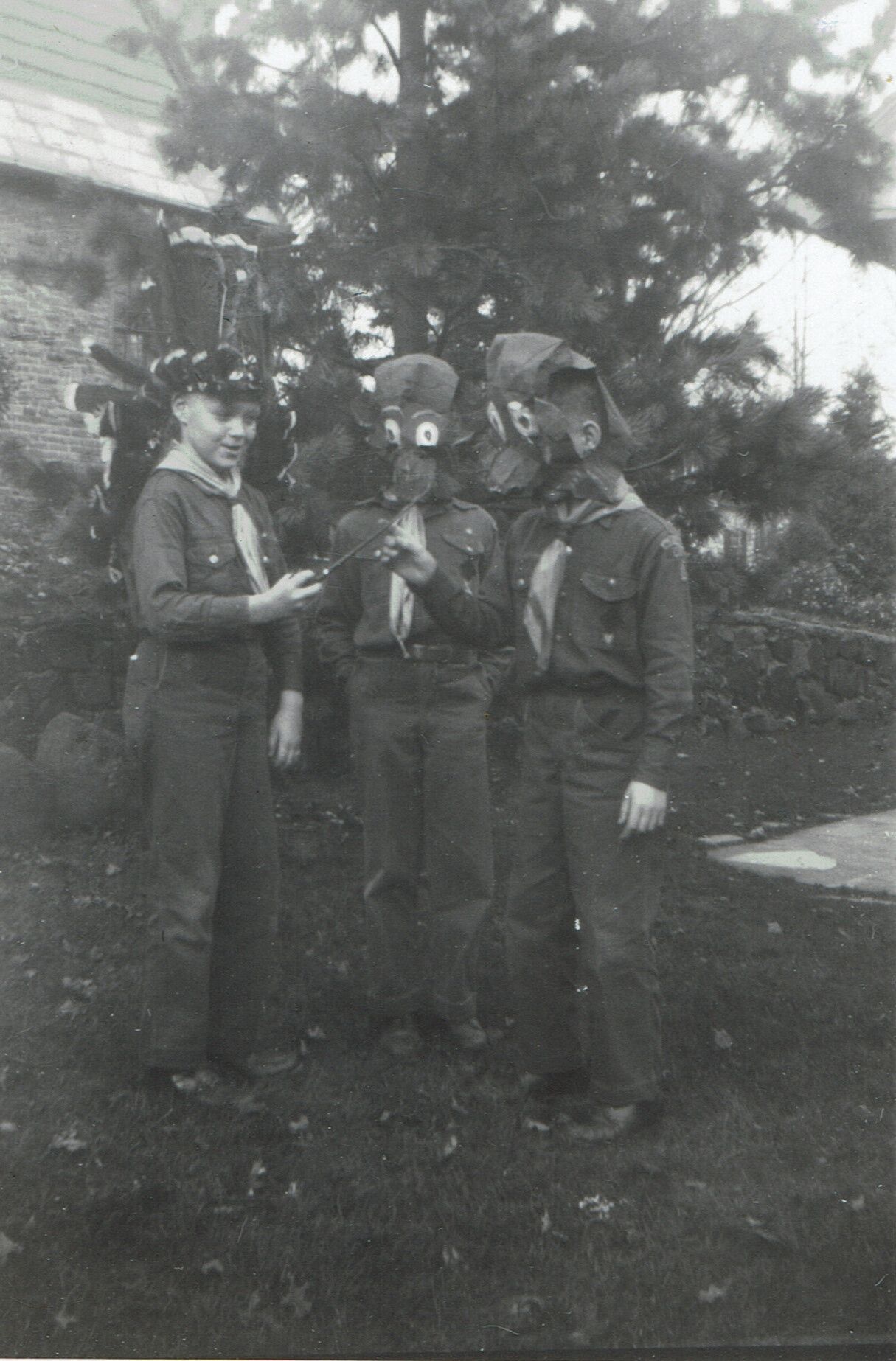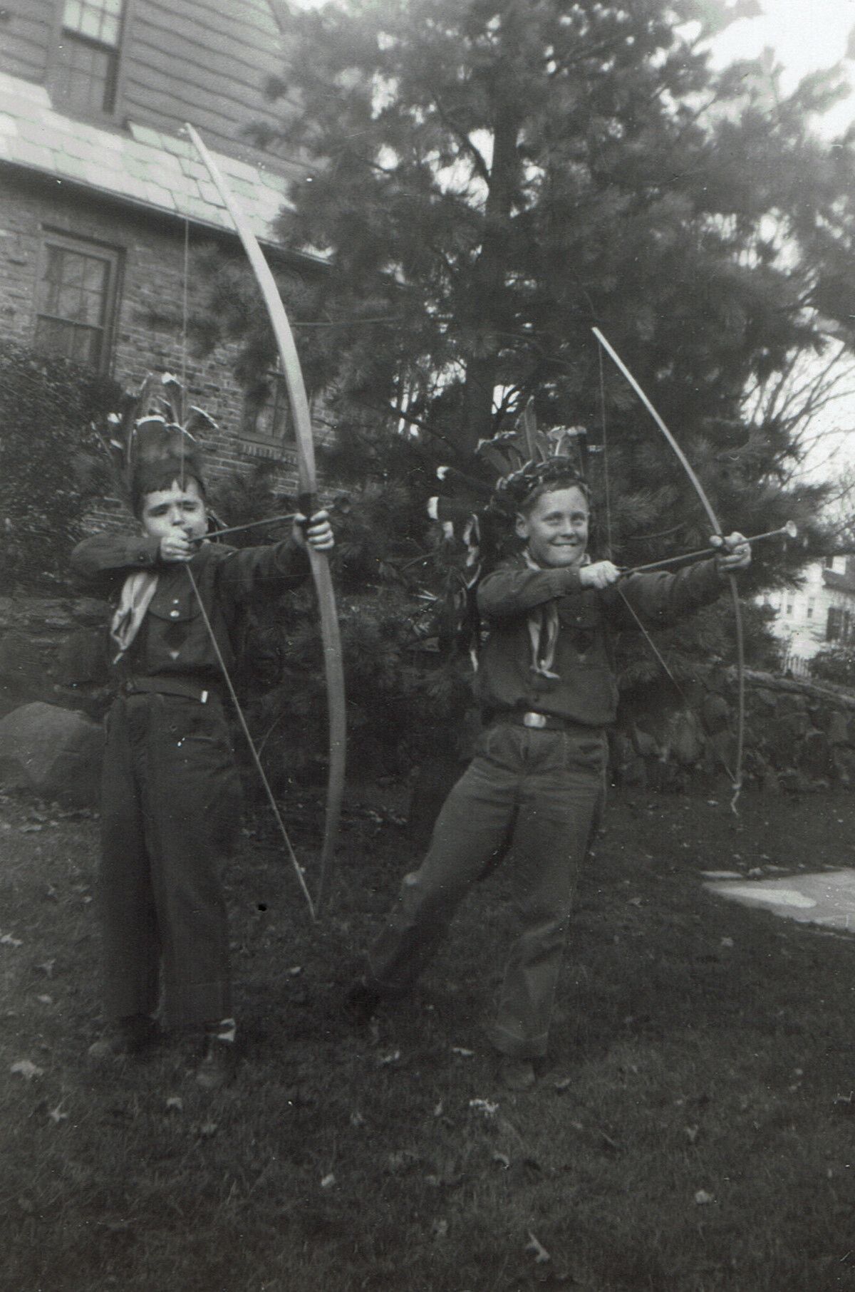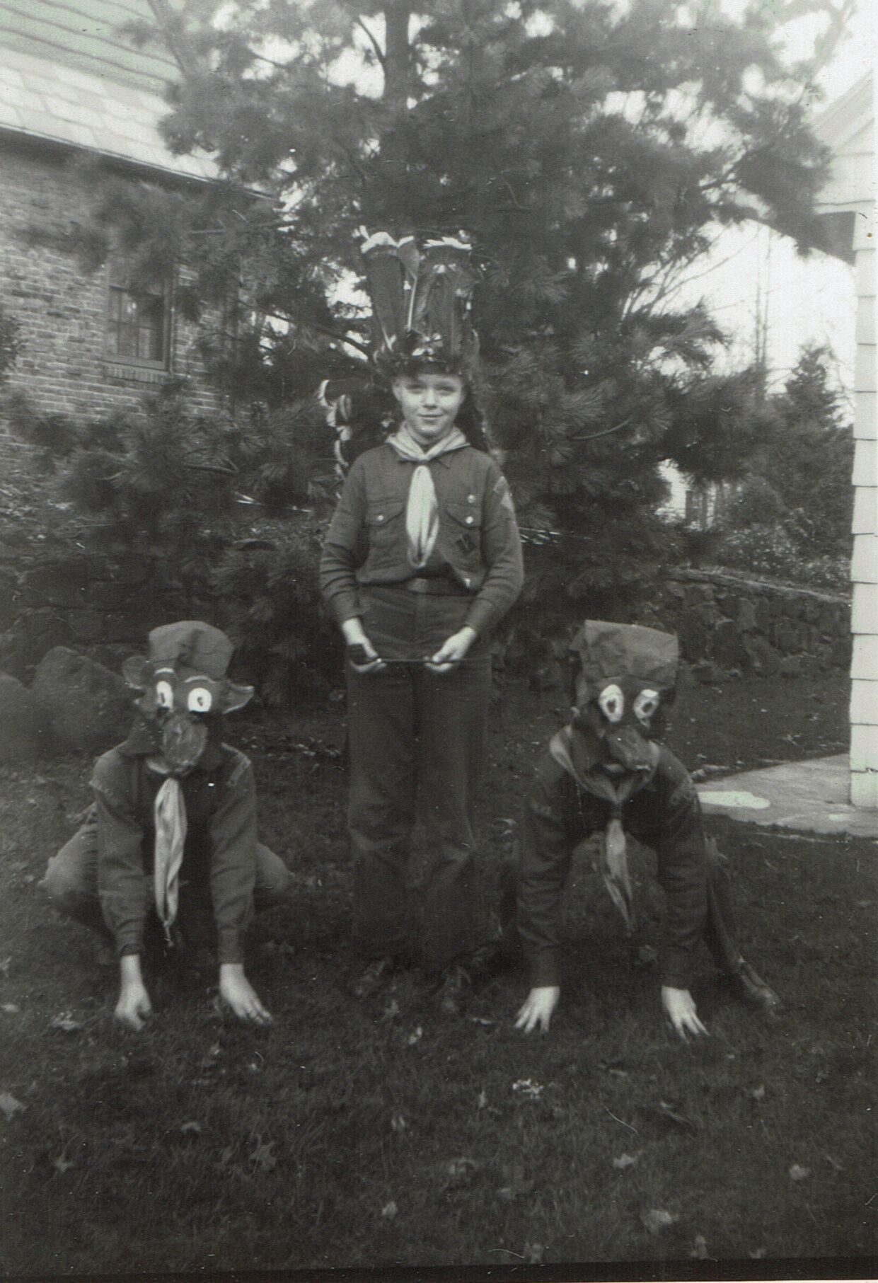 Set of 4 Photographs of Cub Scouts dressed up as American Indians and animals, perhaps for a performance. Photographs were inside a 1951 advancement ceremonies program, donated by Mrs. Charles T. King. Identity of boys is unknown.Acquisition