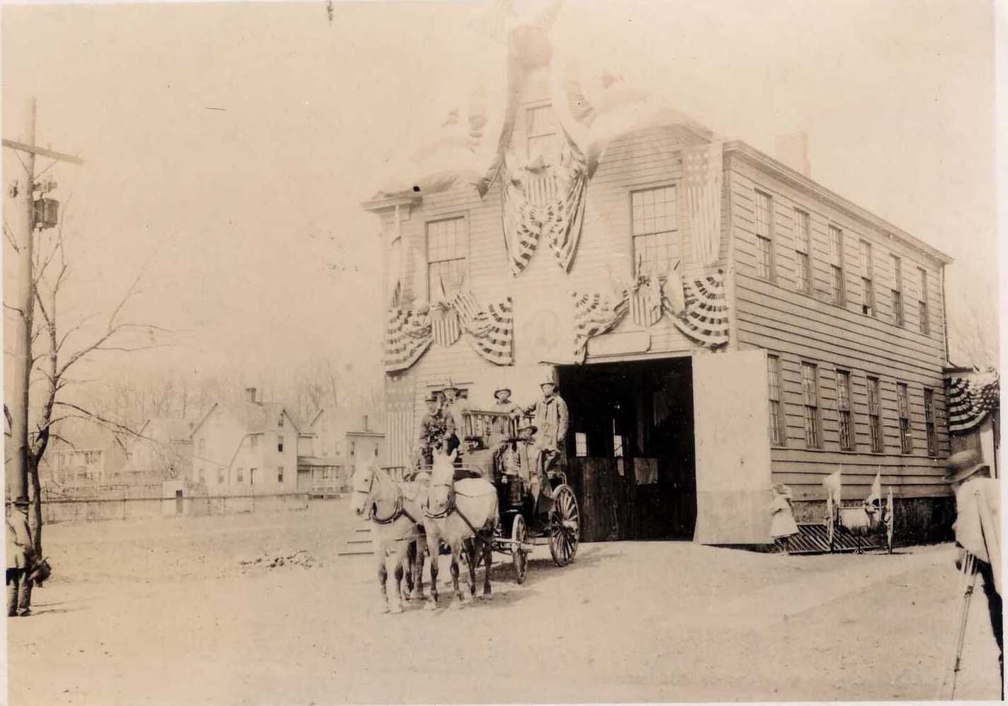 Photograph of Millburn Town Hall decorated for the April 13, 1907 Millburn Semi-Centennial Celebration with a horse-drawn fire truck driven by Roger (Roddy) Marshall and a hose trailer in front of town hall.Collection