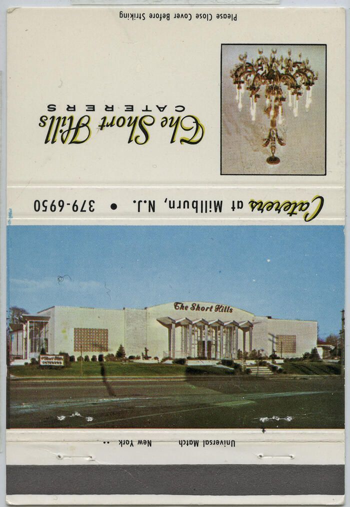 Matchbook cover (empty) from The Short Hills Caterers. Matchbook cover has a color photo of the restaurant on the front cover. "Caterers at Millburn, N.J. * 379-6950" is printed on the spine of the matchbook. The back cover has a small color photo of a chandelier, next to which is printed "The Short Hills Caterers." According to a 2008 article about the business, it opened in 1962. There are staple holes where two staples were removed and there seems to be a slight yellowing around the edges.Acquisition