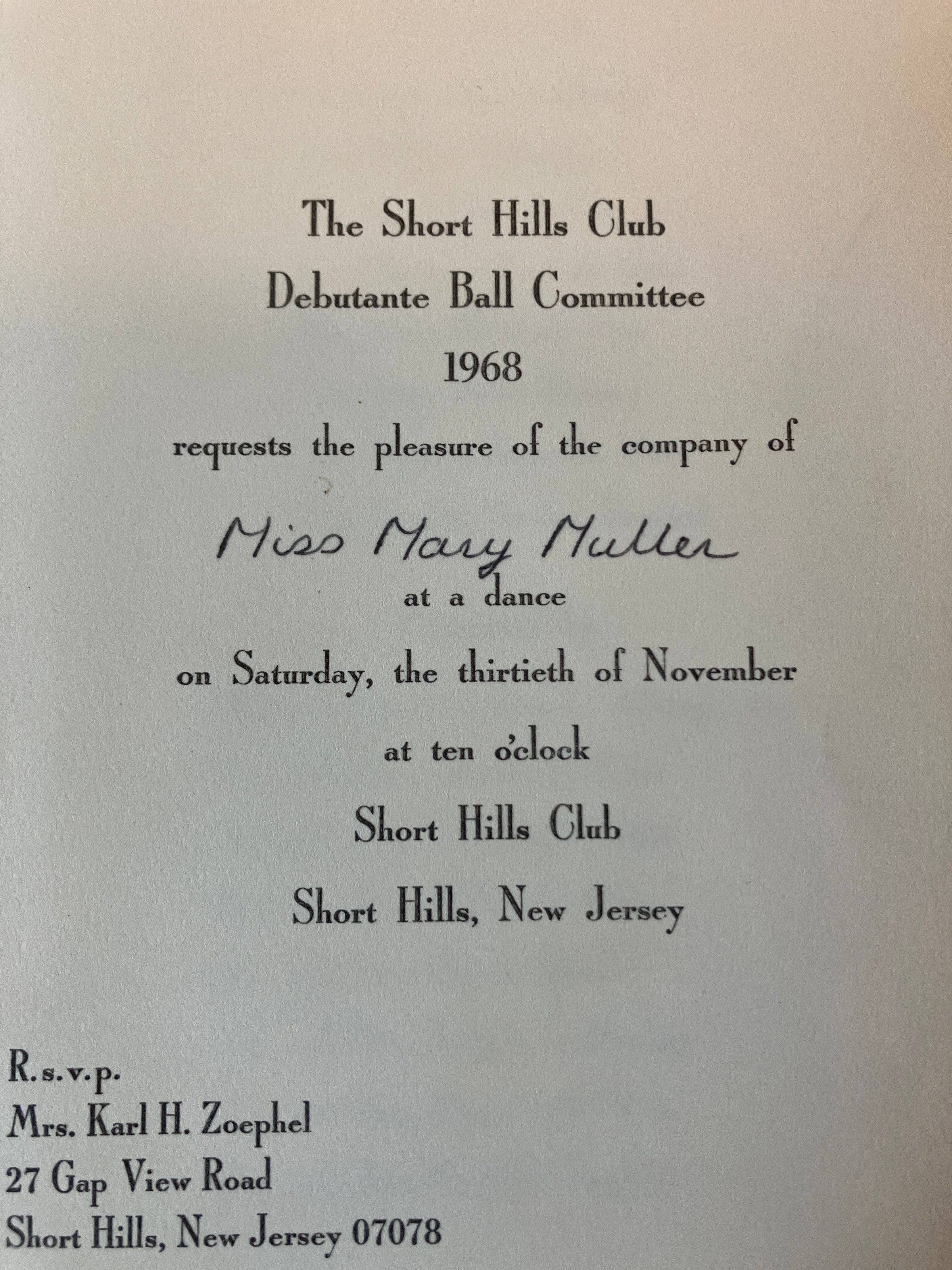 1968 Short Hills Club Debutante Ball Committee invitation to Miss Mary Muller for a dance on November 30, 1968, at the Short Hills Club. RSVP was to Mrs. Karl H. Zoephel, 27 Gap View Road, Short Hills.Acquisition