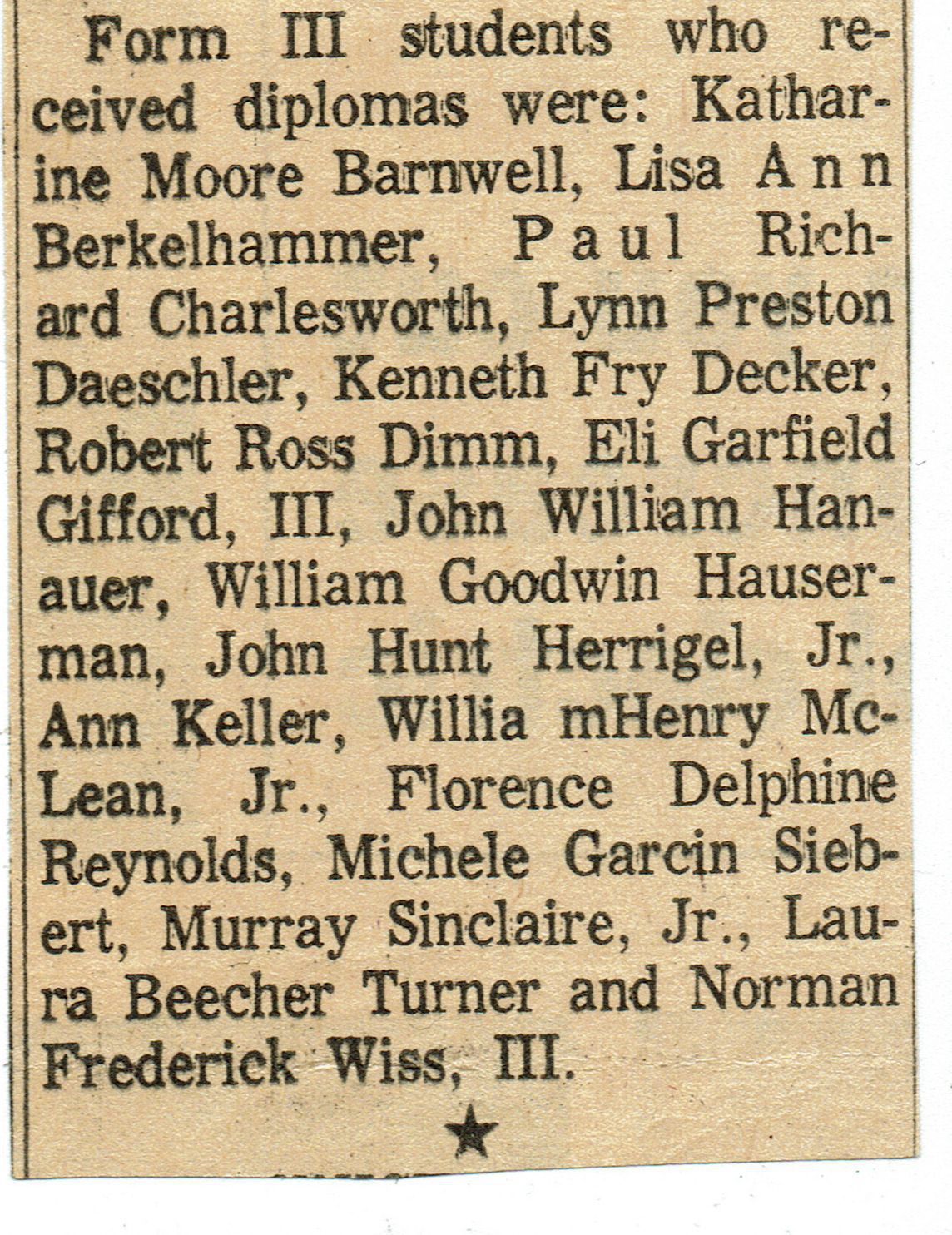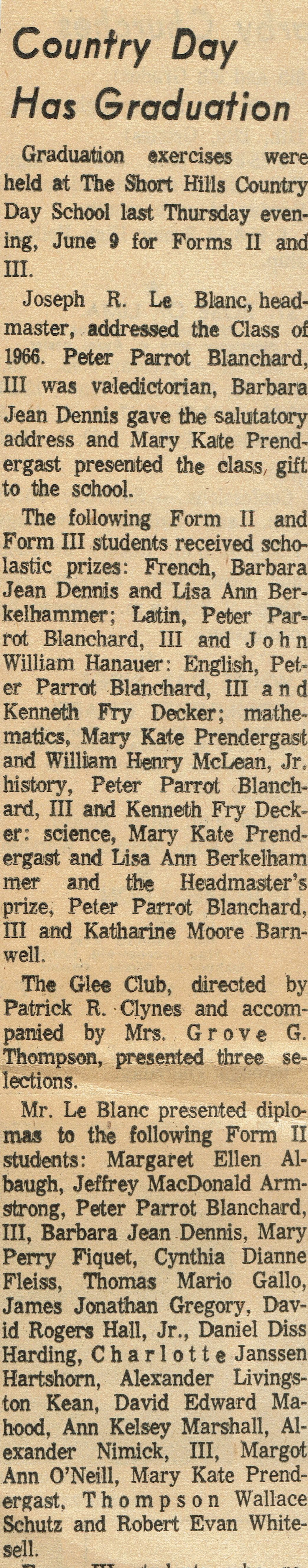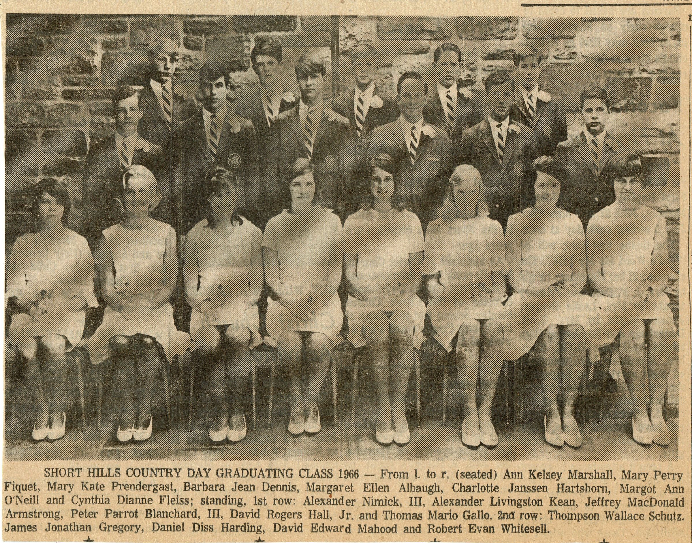 Article and photograph of the Short Hills Country Day School Class of 1966 from the Item, June 16, 1966. Pictured are: (seated, l to r)Ann Kelsey Marshall, Mary Perry Fiquet, Mary Kate Prendergast, Barbara Jean Dennis, Margaret Ellen Albaugh, Charlotte Janssen Hartshorn, Margot Ann O'Neill and Cynthia Dianne Fleiss; (standing 1st row) Alexander Nimick, III, Alexander Livingston Kean, Jeffrey MacDonald Armstrong, Peter Parrot Blanchard, III, David Rogers Hall, Jr., and Thomas Mario Gallo. 2nd Row: Thompson Wallace Schultz, James Jonathan Gregory, Daniel Diss Harding, David Edward Mahood and Robert Evan Whitesell.Acquisition