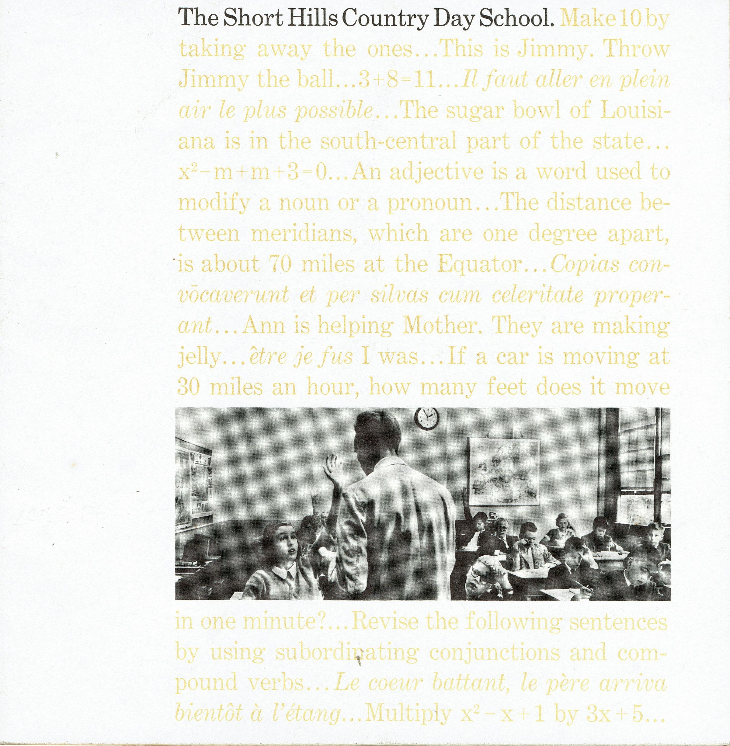 This pamphlet was made by the Short Hills Country day school to raise funds for a new school. The private school, which was founded by Stewart Hartshorn, had reached maximum capacity and needed to expand. The pamphlet outlines the plans for a new school building to be located on a 34-acre site on White Oak Ridge Road to house up to 300 students from pre-school to 9th grade, with the potential to expand to 12th grade in the future. The initial building project was to be completed in late 1961 or early 1962. 20 pp., illustrated with B&W photographs and architectural plans.Acquisition