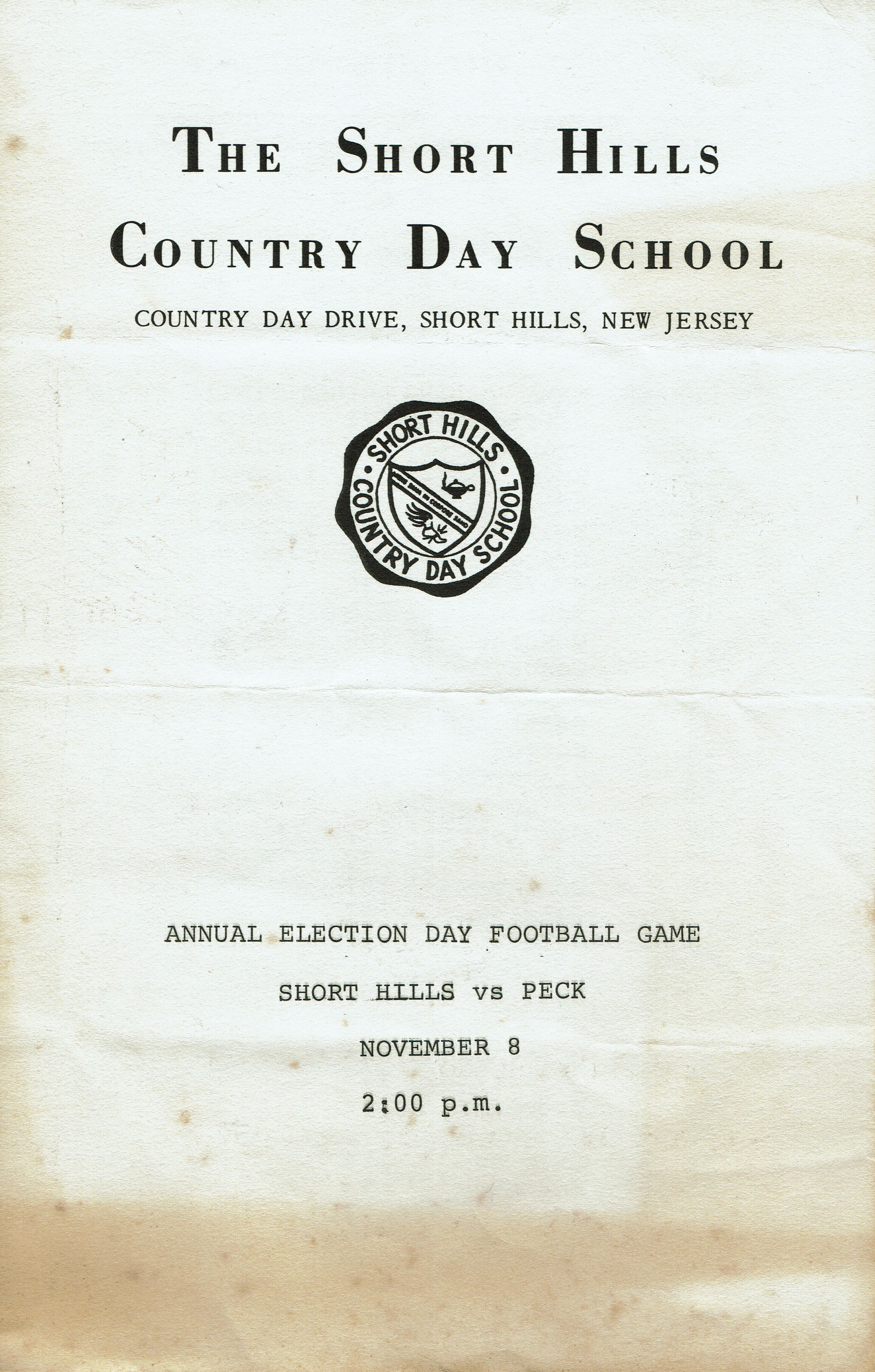 Program from the Short Hills Country Day School Annual Election Day Football Game, Short Hills vs. Peck, Held on November 8. The program does not give the year, but probably from the 1960s.Acquisition