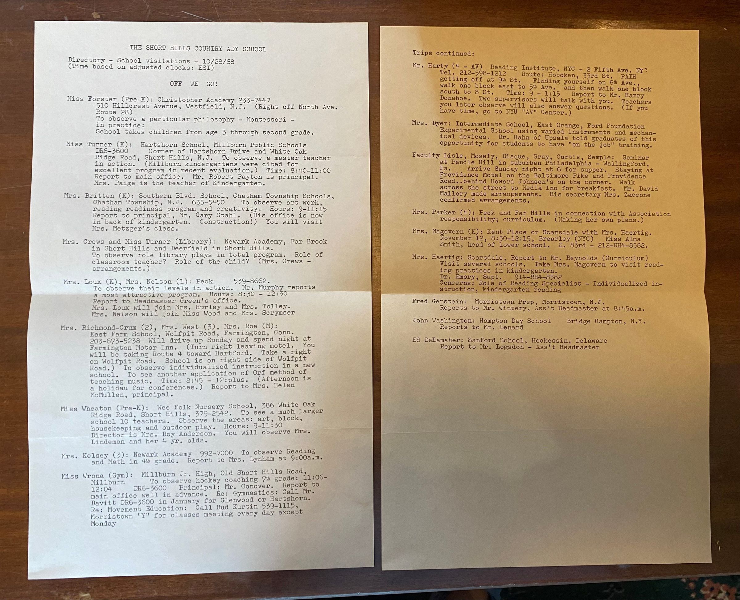 Two pages listing detailed notes of school visitations on October 28, 1968. Each section includes the person talked to, as well as the school which was visited and notes from the interview.Acquisition