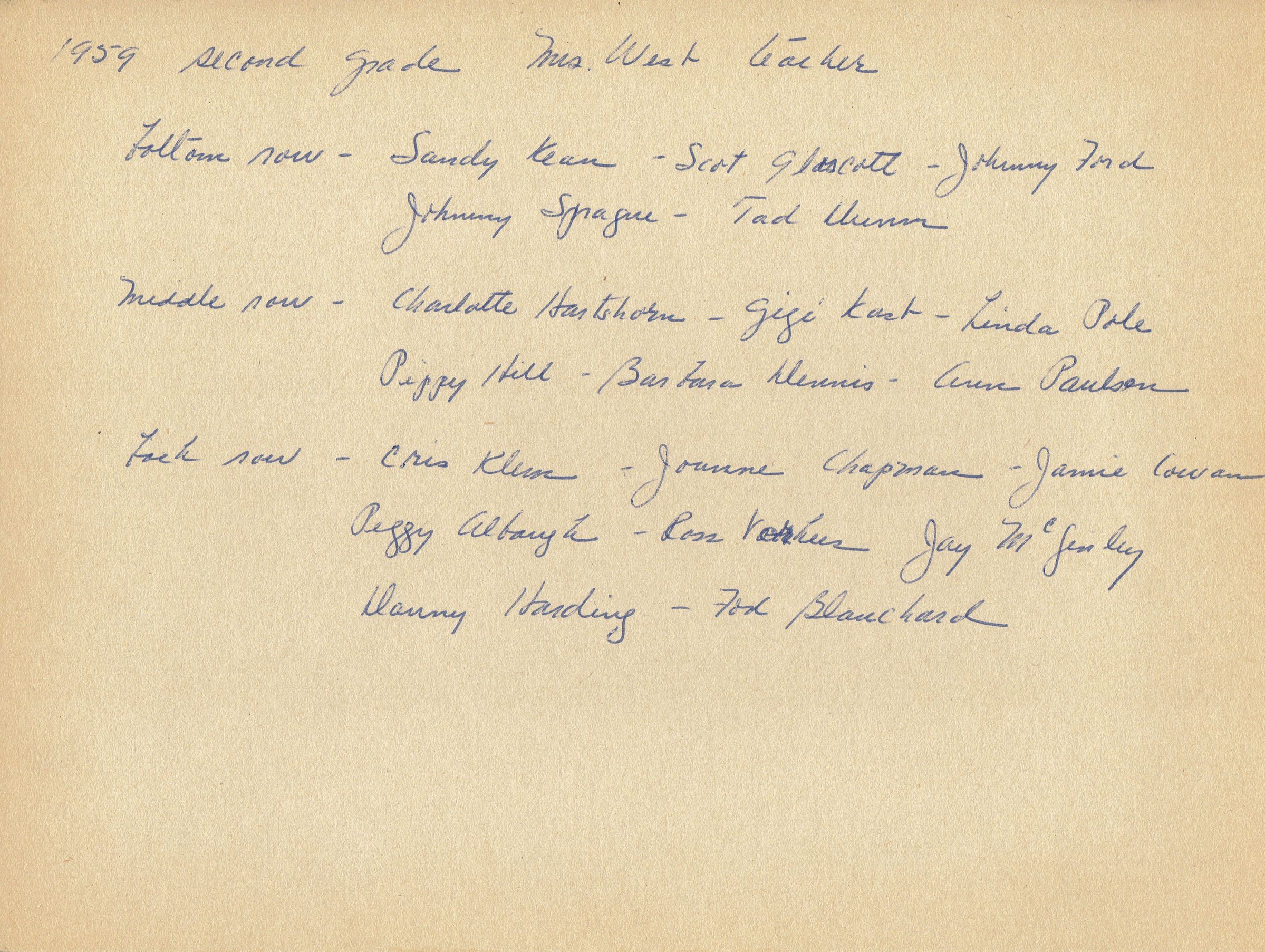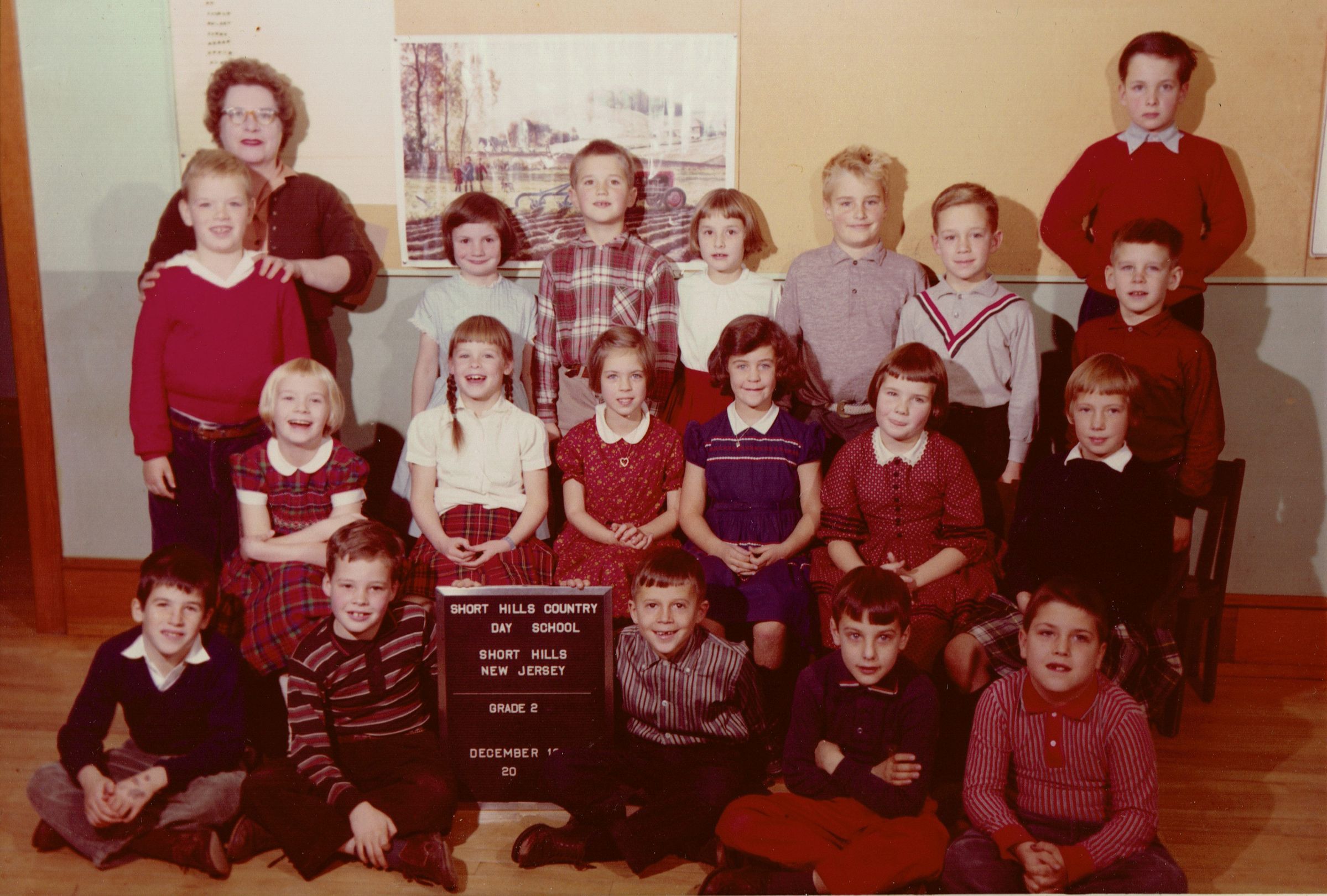 Photograph of Mrs. West's second grade class at the Short Hills Country Day School, December 1959. Inscription on verso of photo lists the following identifications: