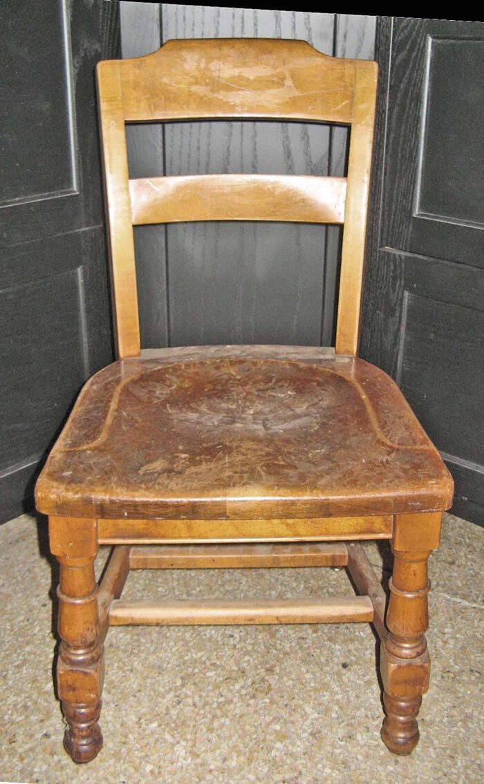 Child's chair from Short Hills Elementary School. Soiled, worn and scraped seat. Overall soiling. Pen and pencil scrapings on the back of the chair. Deep scrape on the seat of the chair 2.5 " long. Green marker along the side of the chair. There is a label on the bottom of the chair that says "Millburn, N.J. Public Schools".Acquisition
