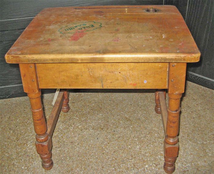 Desk: Short Hills Elementary School desk with "Eliza Rox" in green marker with cloud-like markings around the name. 24"w x 18" deep x 24" height. Desktop is soiled and very worn. It has a lift up lid, a groove at the top of the desk for pencils, a hole for an inkwell with green marker lines drawn out of it. There is a red marker smudge on the desk top approximately 2" x 4" and pen and pencil scrapes across the desk. The desk is marked on the bottom "W. H. Gunlooke Chair Co. Wayland New York" and there are some residual yellow and red paint smears.Acquisition
