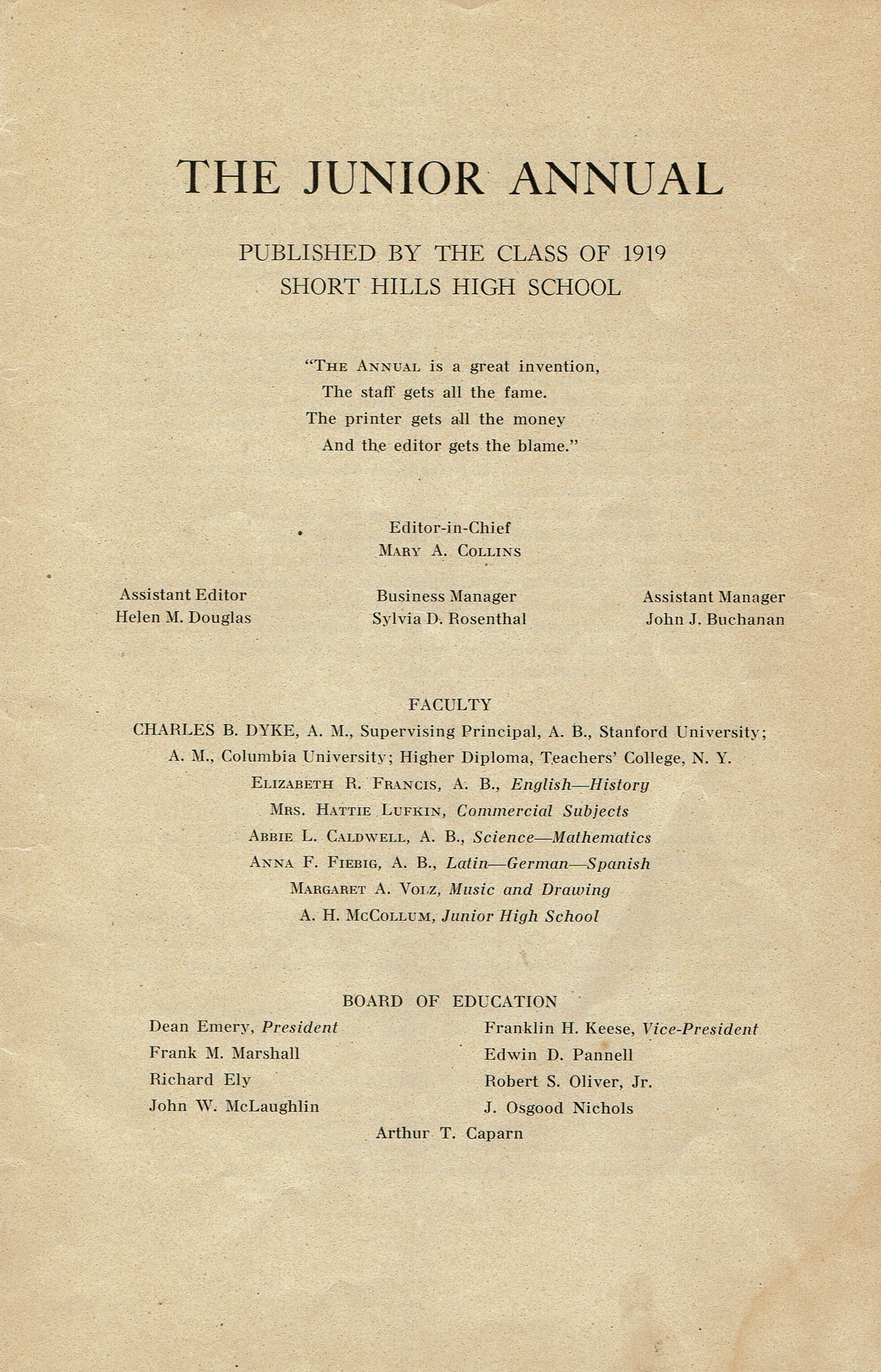 Yearbook produced by the Junior Class of the Short Hills High School in 1918. Includes photos of the 1918 Senior Class, the 1918 Junior Class--Graduating Class of 1919, the Classes of 1920 & 1921. Illustrated with B&W photographs and advertisements from local businesses.Acquisition