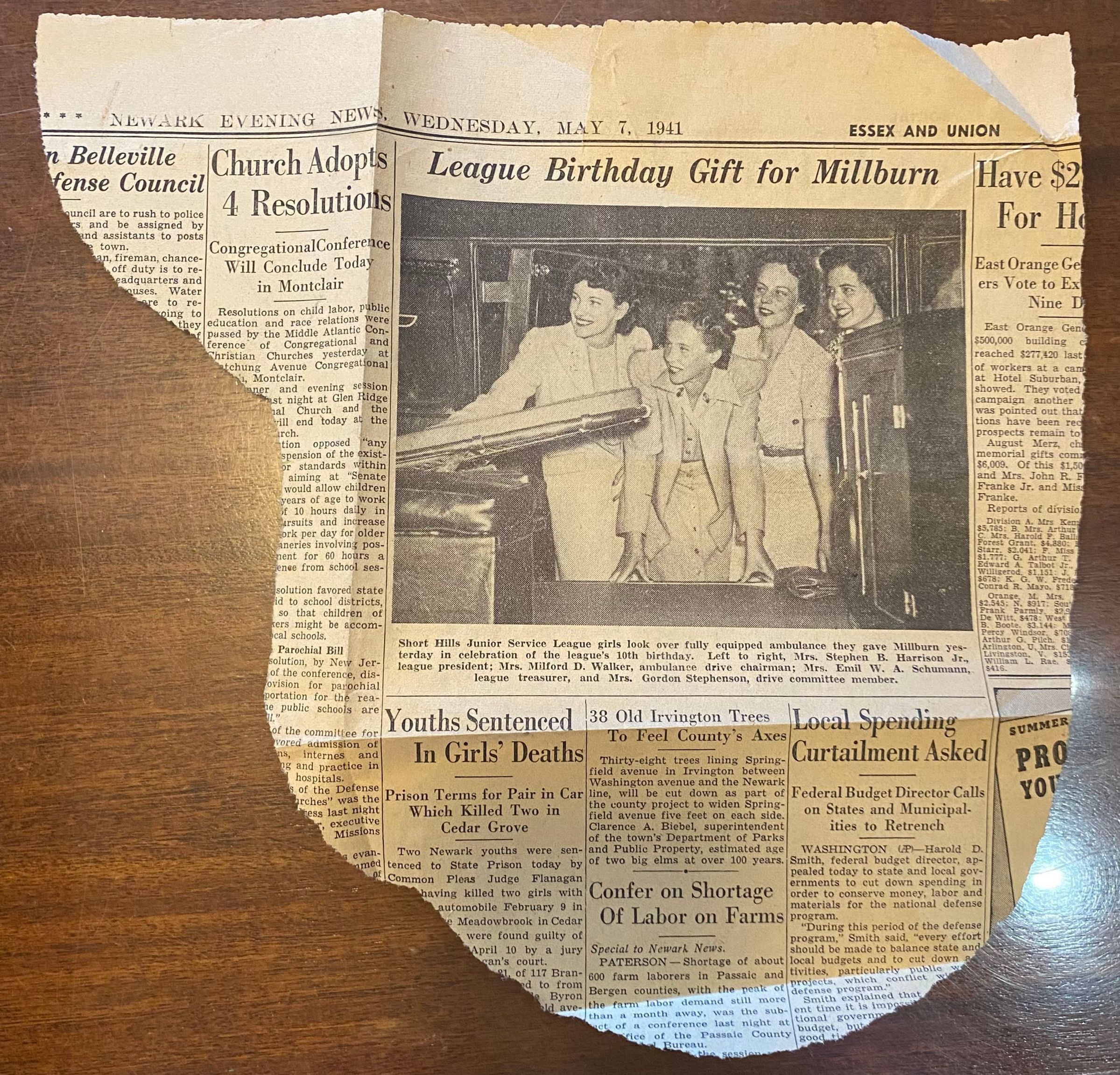 A newspaper clipping from the Newark Evening News on Wednesday, May 7, 1941. The article is titled "League Birthday Gift for Millburn" and details the Short Hills Junior Service League girls gifting an ambulance to Millburn. The people listed as part of the group include: Mrs. Stephen B. Harrison Jr., Mrs. Milford D. Walker, Mrs. Emil W. A. Schumann, and Mrs. Gordon Stephenson.Acquisition