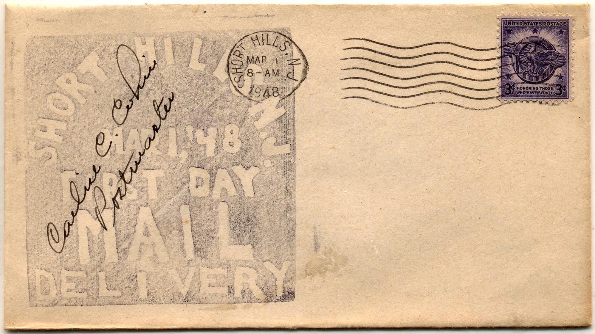 Short Hills First Day Mail Delivery Envelope with Postmaster Signature from 1948