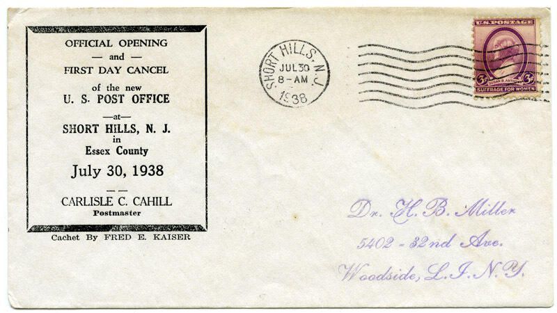 An envelope with light overall yellowing from the 1938 Short Hills Post Office Dedication on July 30, 1938. Upper left corner says, "Official Opening and First Day Cancel of the new U. S. Post Office at Short Hills, N.J. in Essex County; July 30, 1938; Carlisle C. Cahill; Postmaster". Envelope has been used and has 3 cents stamp in upper right corner with Short Hills Postmark with above date. Envelope is addressed in light purple script to: "Dr. H.B. Miller; 5402- 32nd Ave.; Woodside, L.I. N.Y.". On back is Flushing, N.Y. postmark in black. Purchased on eBay.Acquisition