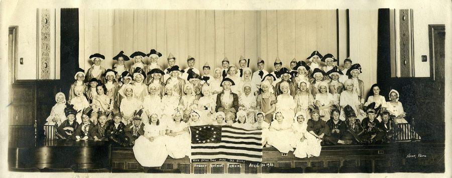 Photograph of the operetta, "When Betsy Ross Made Old Glory," by students, ages 8-12, at the Short Hills School on Hobart Avenue on April 22, 1932. Identification of the following students on verso of photo: Top Row, 5th from left: George Saxton, 6th from right: Donald Hines; Second Row from Top, 4th from left: Clement Kaupp, 9th from left: Constance Ward, 7th from right: Marjorie Fedderman, 3rd row from top, 2nd from left: Betty Faddis, 5th from right: Thelma McKee, Bottom Row, 2nd from left: Bob Seaman, 6th from left: Nancy Morrison, 4th from right: Billy Taylor, 6th from right: June Sleeper, 7th from right: Teddy Colyer.Acquisition