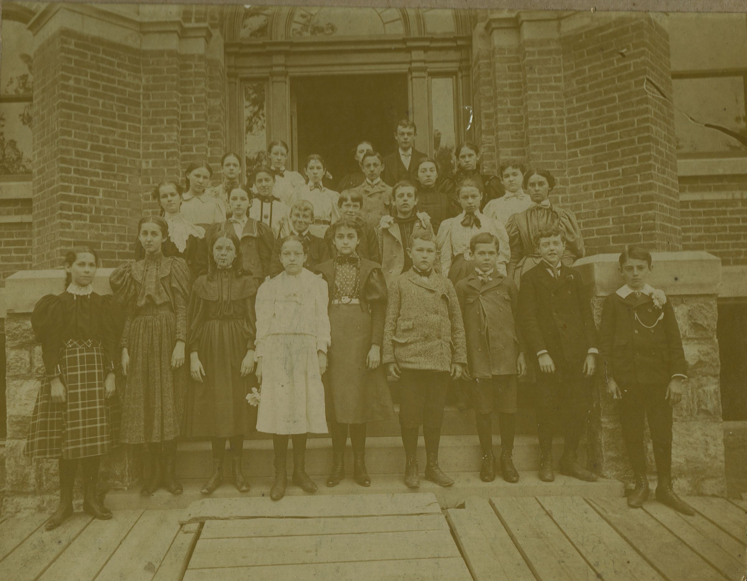 Photograph of students outside the Short Hills School, c. 1900. The photograph belonged to M. (Marianne) Blood, who may be in the picture.Collection