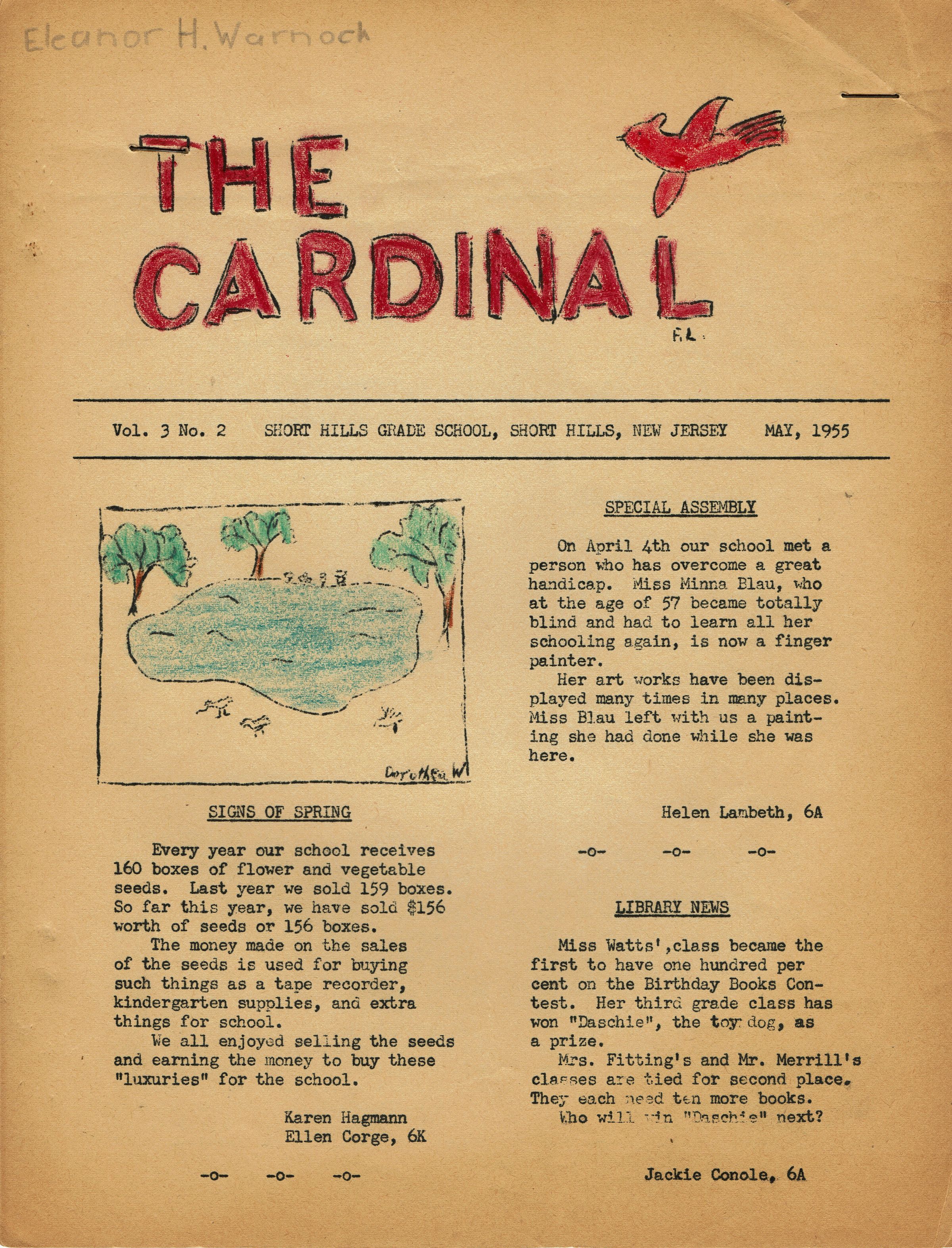 Four editions of the Cardinal Newsletter from the Short Hills Grade School, Hobart Avenue, Short Hills: November 1953, March 1954, May 1955, December 1955. May 1955 issue belonged to Eleanor Warnock. Typed and stapled newsletter with colored illustrations.Acquisition