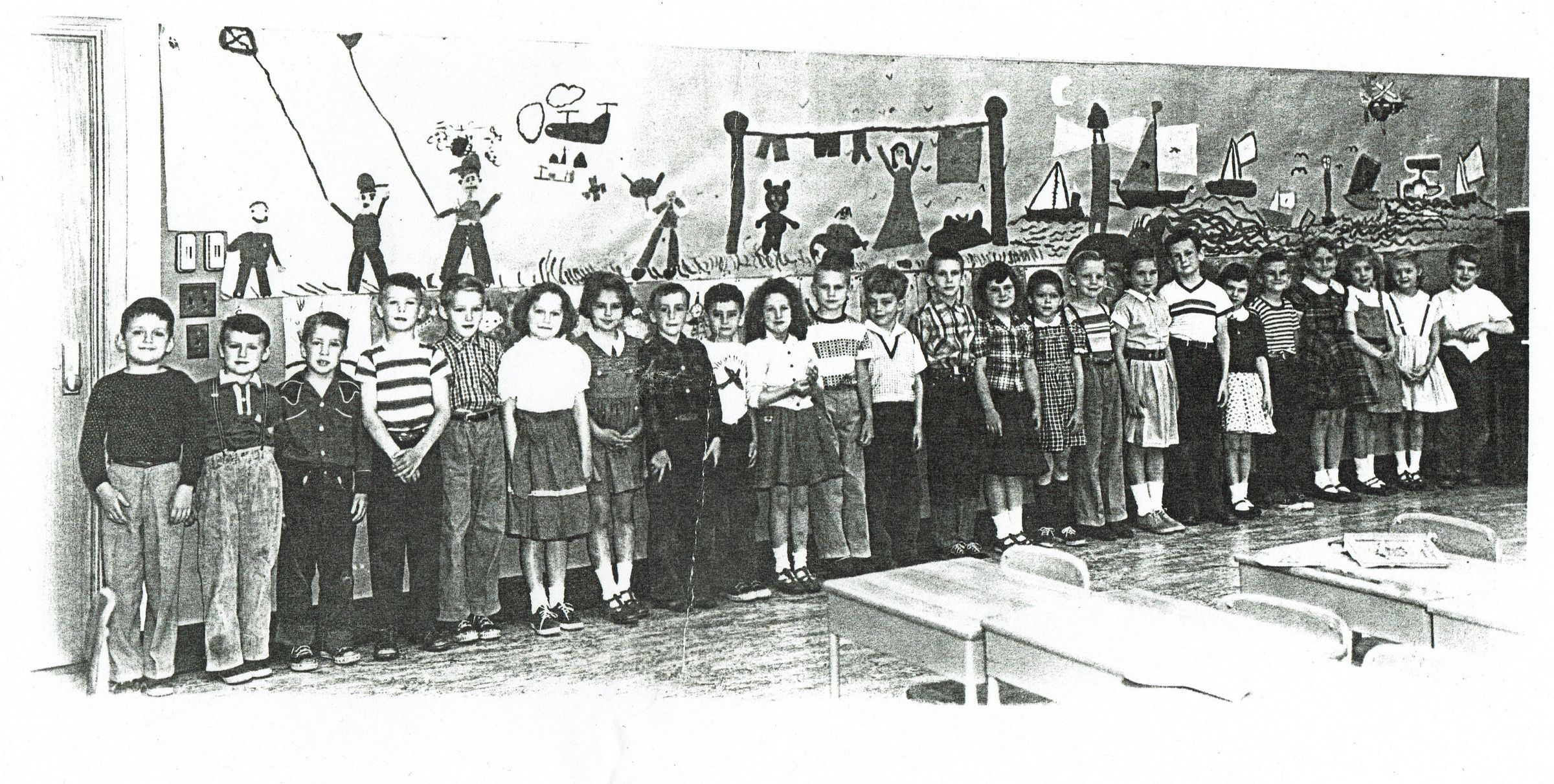 Copy of a photograph of a class at the Short Hills Elementary School from c. 1953-4. The photo was of Mrs. Van Vorhees' first grade class at the Short Hills School on Hobart Avenue. It was probably taken 1953-54. The occasion probably for the photo was that the mural behind the students was painted by them and probably just completed. Identification by Russ Cozier, Joseph Akers and Jimmy Hermiston as follows from left to right: