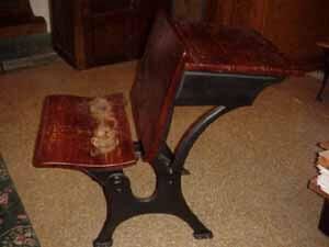 One-piece desk/chair with wood seat and desk and plain, iron legs. Water rings on seat seem to indicate that it may have been used as a planter after it ceased to be used as a desk. The pencil groove on the rear of the desktop is off-center and runs off the left edge (as you would sit at the desk), as though the other half of the groove was on an adjoining desk.Acquisition
