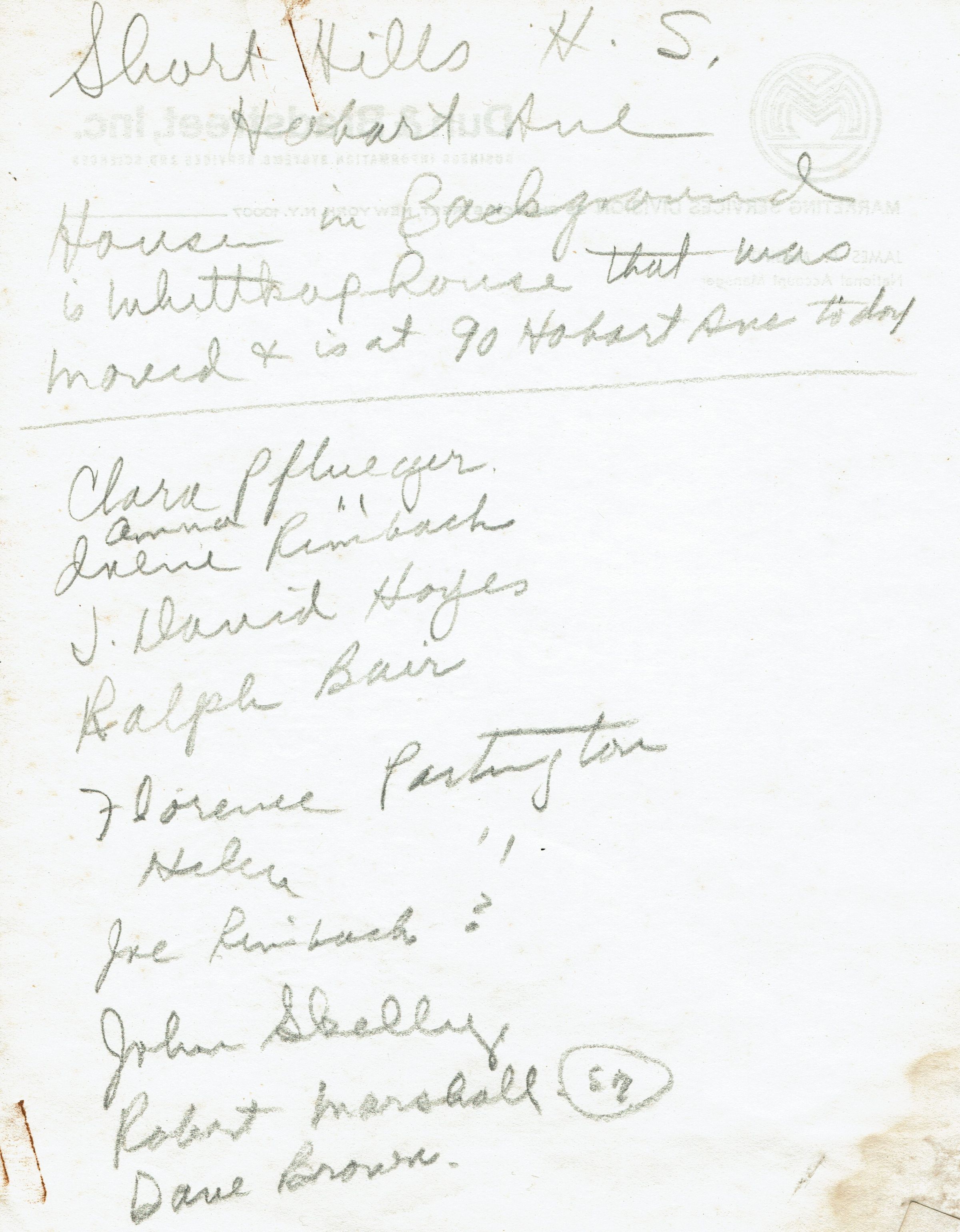 Photograph of the Short Hills High School with notes from John Murray. Notes read: Short Hills High School, Hobart Road. House in Background is Wittkop house that was moved and is at 90 Hobart Avenue today. The following people are identified in the photograph: Clara Pflueger, Anna Pfleuger, Irene Rimback, J. David Hoye, Ralph Bair, Florence Partington, Helen Partington, Joe Rinback (?) John Skelly, Robert Marshall, Dave Brown, Helen Cook.Collection