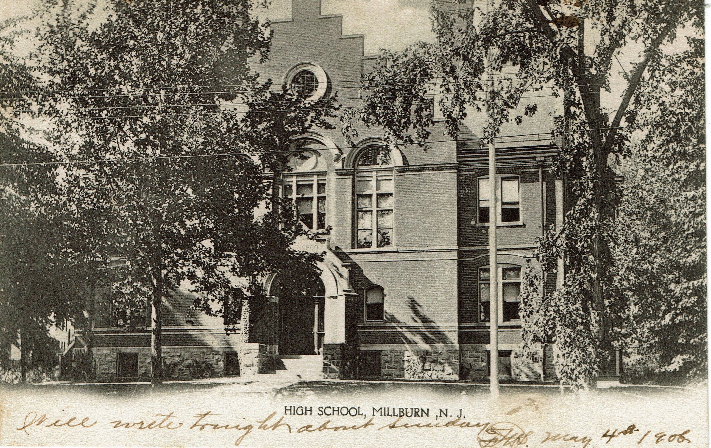 Postcard of the Short Hills School from the period in which it served as a high school. Postmarked Short Hills, May 4, 1906 at 4:00 pm, received Bernardsville, NJ May 4, 1906 at 7:00 pm. Addressed to Miss A.M. Riddle, Bernardsville, NJ. Message on front of card reads: "I'll write tonight about Sunday." May 4, 1906Collection