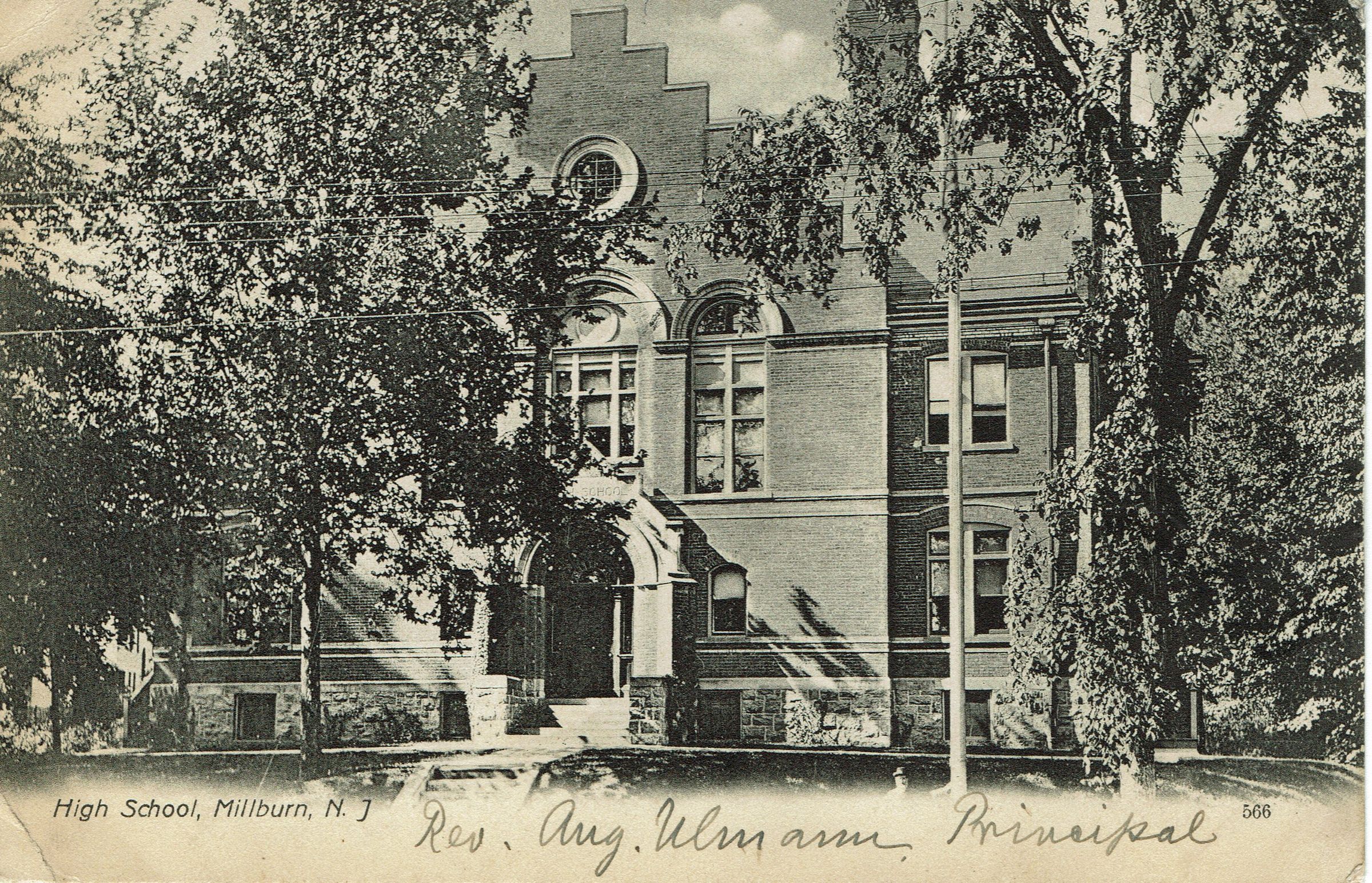 Postally used B&W photographic postcard entitled "High School, Millburn, N.J." depicting the Short Hills School on Hobart Avenue, which housed the Millburn High school at the time. Postmarked Newark, September 17, 1907. Handwritten note on front of postcard states: Reverend Aug. Ulmann, Principal.Collection