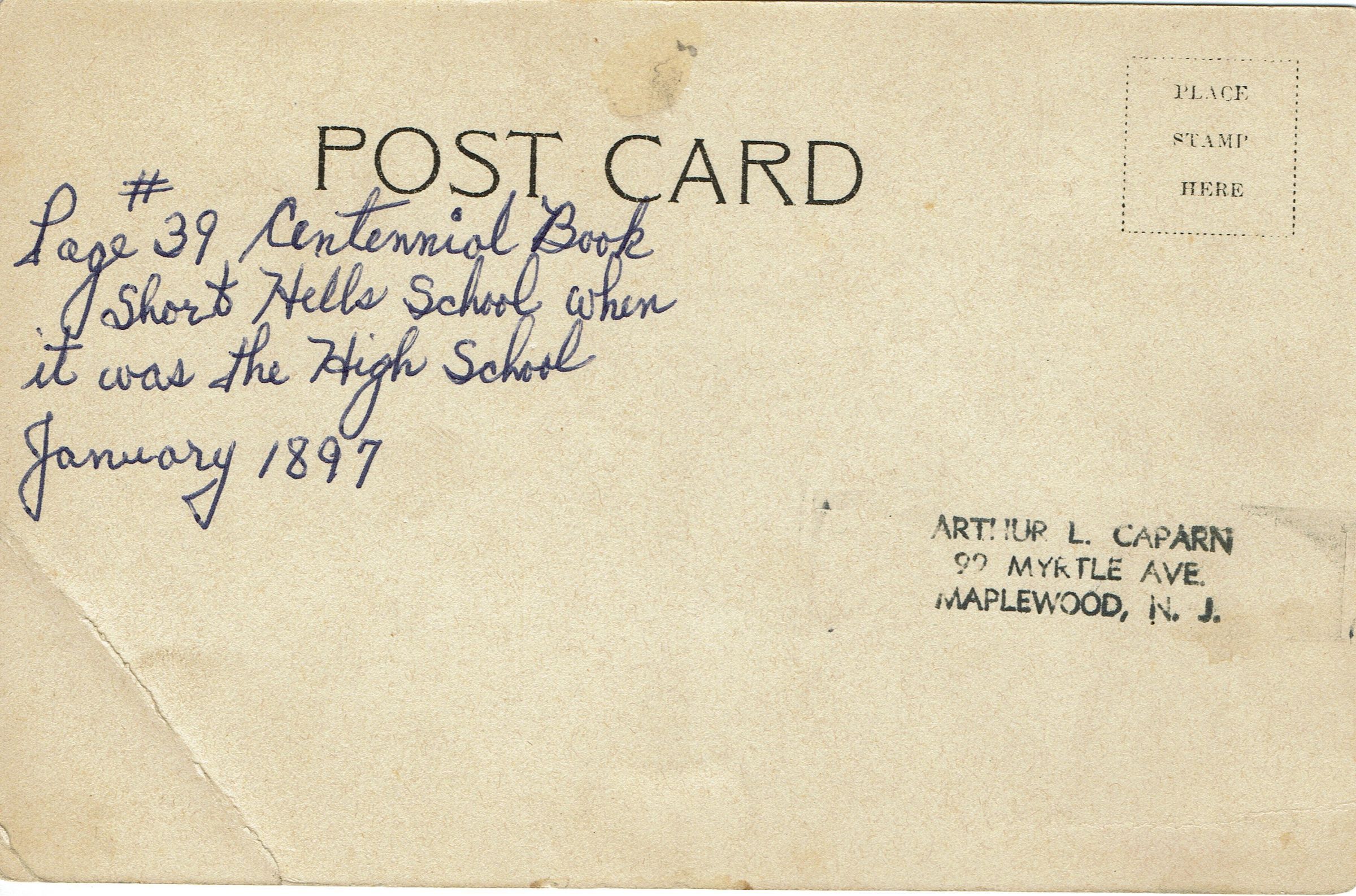 Postcard of the Short Hills School when it was the high school in Millburn. Inscription on back notes the image appears on page 39 in the Centennial Book and dates it to January, 1897. Postally unused, contains a stamp from the realtor Arthur Caparn, 99 Myrtle Avenue, Maplewood, NJ.Collection