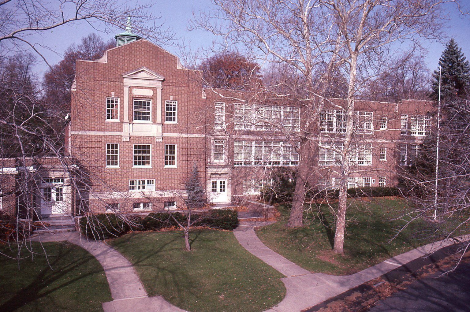 Color Slide of the Short Hills School on Hobart Avenue taken by Owen Lampe from a bucket truck in December 1983.Photograph Details