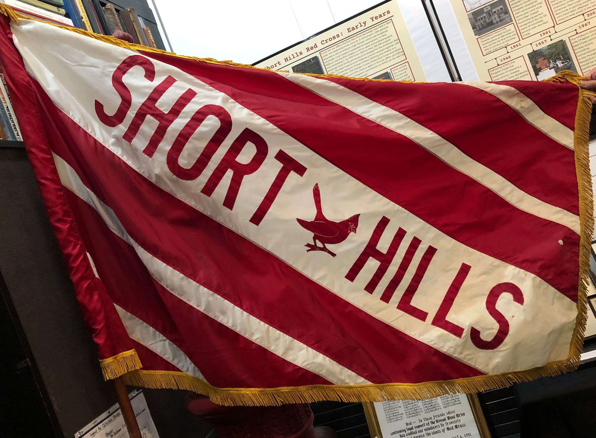 Flag from the Short Hills School on Hobart Avenue featuring the Cardinal mascot.