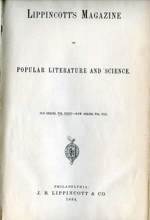 July through December 1884 editions of Lippincott's Magazine bound in a hardcover book. The July 1884 edition has an article, "Some Suburbs of New York," which includes a section on Short Hills with sketches of Christ Church, the Music Hall, Greystone, Redstone, and the Anchorage.Acquisition