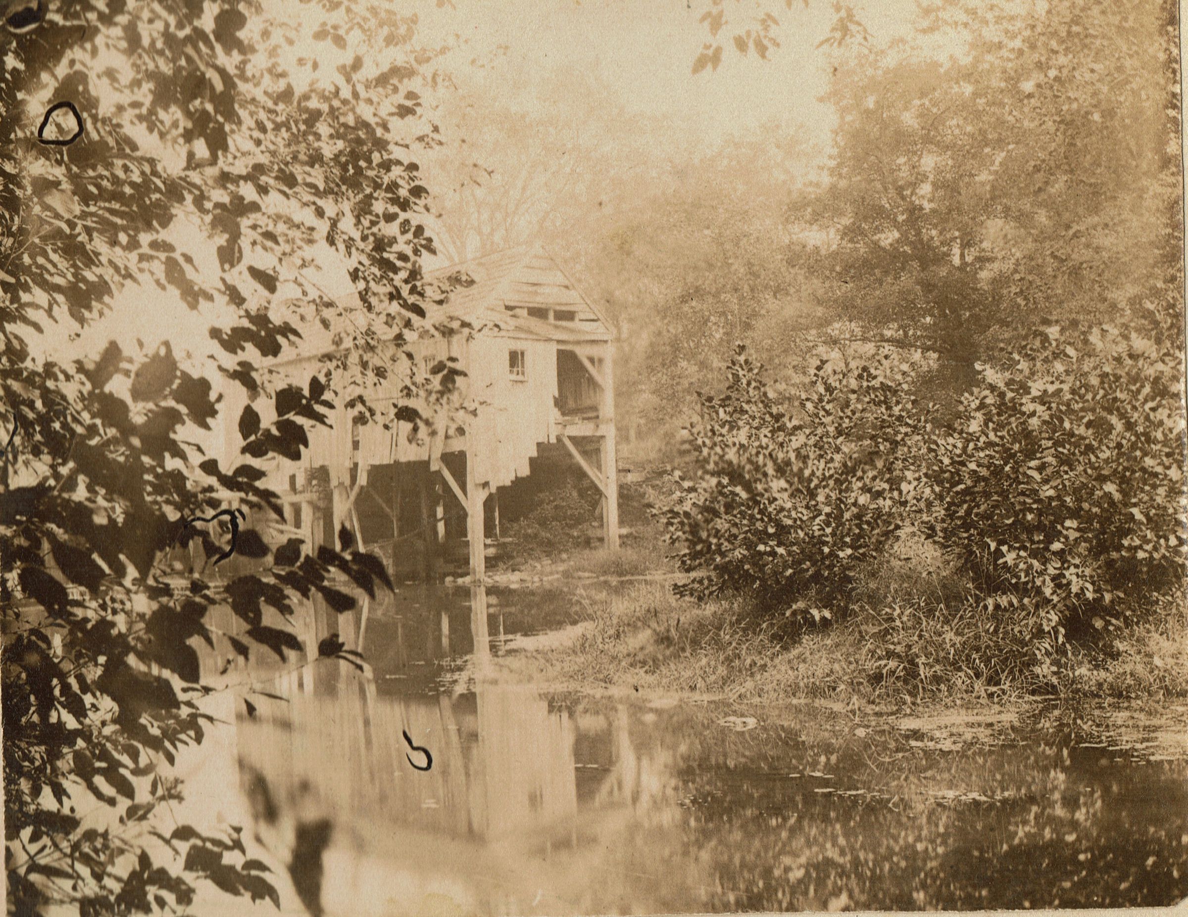 Photograph of the Hartshorn-Built Short Hills Train Station from a c. 1900 photo album. Album was taken apart. This station was built by Stewart W. Hartshorn as an inducement to the Delaware, Lackawanna & Western Railroad to have commuter trains stop at this new village. Upon the railroad's promise to stop 2 trains daily, he provided the land and spent $2,500 to build the station. Hartshorn also hired and paid a station master and maintained the station for many years. When Hartshorn built the station, he had the railroad agree that underpasses should be constructed so as to eliminate three grade crossings and furnished the necessary land. On July 2, 1892, the original depot was deeded to the railroad and remained in use until February 1907, when it was demolished to make way for a new station.Dimensions