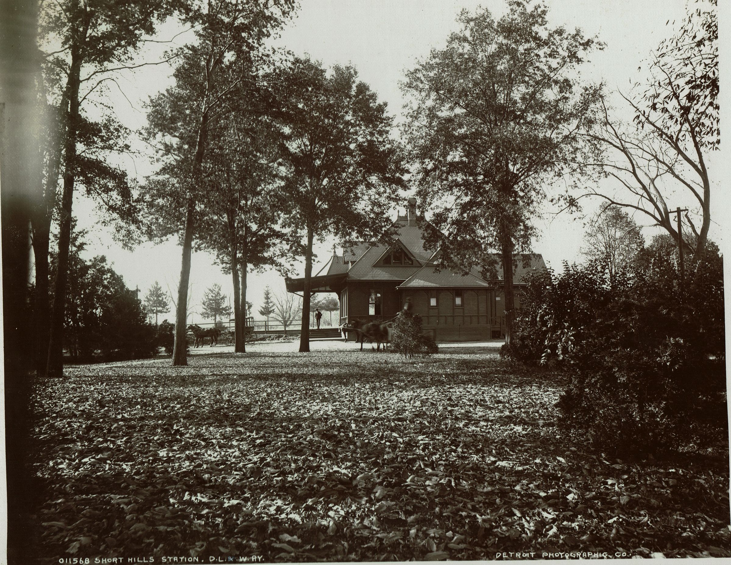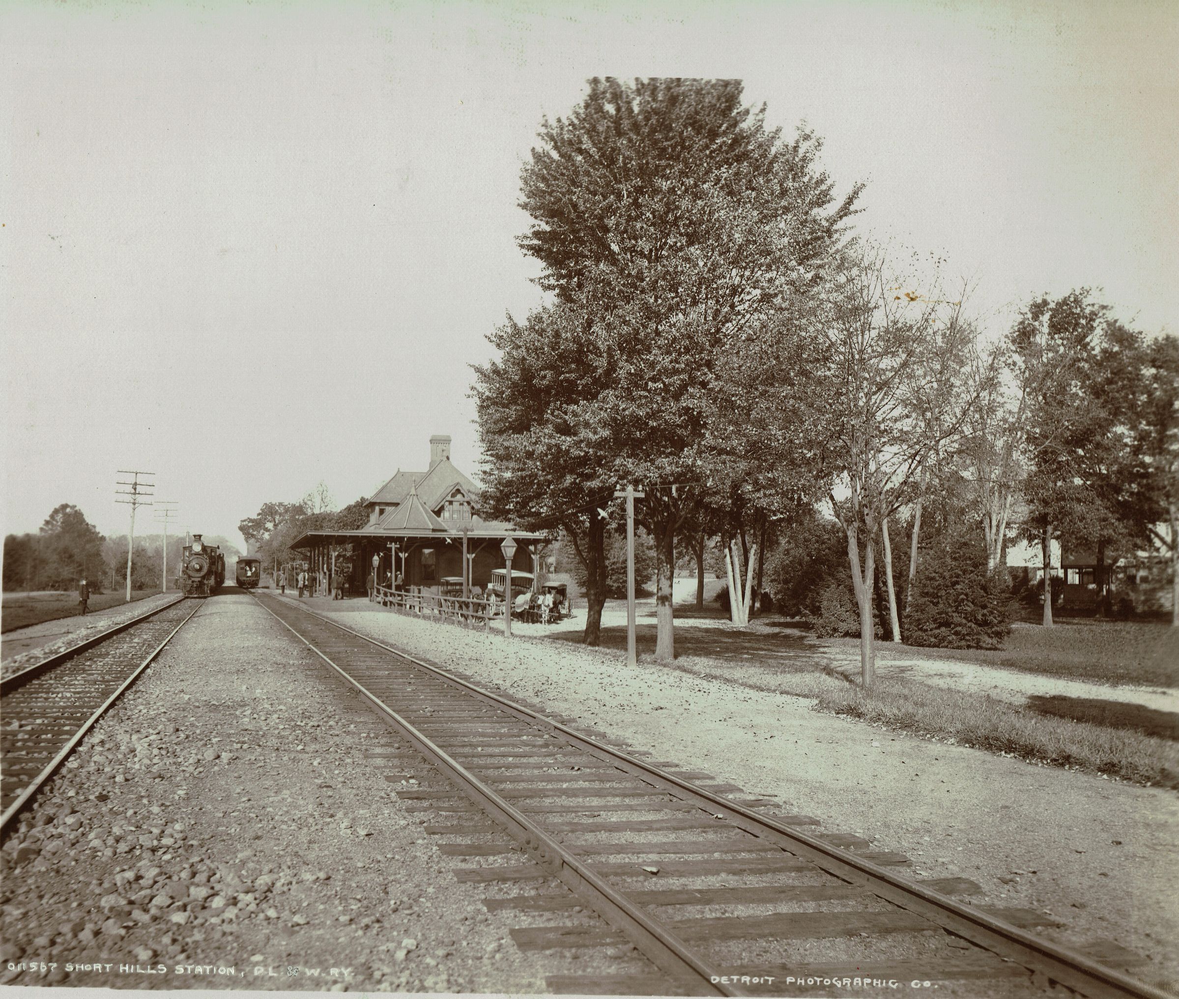 Photograph of the Short Hills Train Station as seen from the park. Verso contains photograph of the station with train approaching. This station was built by Stewart W. Hartshorn as an inducement to the Delaware, Lackawanna & Western Railroad to have commuter trains stop at this new village. Upon the railroad's promise to stop 2 trains daily, he provided the land and spent $2,500 to build the station. Hartshorn also hired and paid a station master and maintained the station for many years. When Hartshorn built the station, he had the railroad agree that underpasses should be constructed so as to eliminate three grade crossings and furnished the necessary land. On July 2, 1892, the original depot was deeded to the railroad and remained in use until February 1907, when it was demolished to make way for a new station.Acquisition