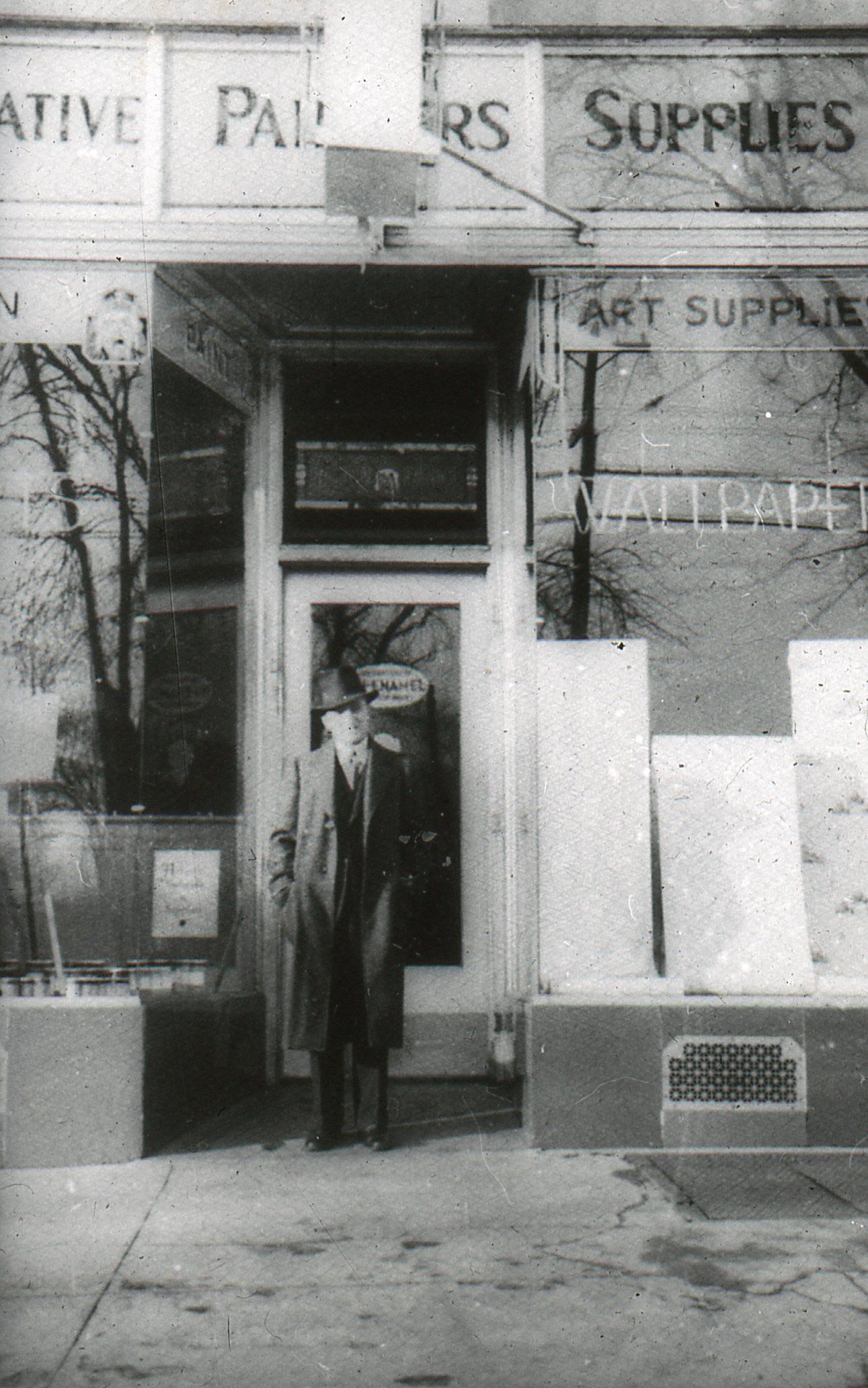 Photograph of Lou Silbersher standing outside his paint store/art gallery at 317 Millburn Avenue in 1937.Photograph Details